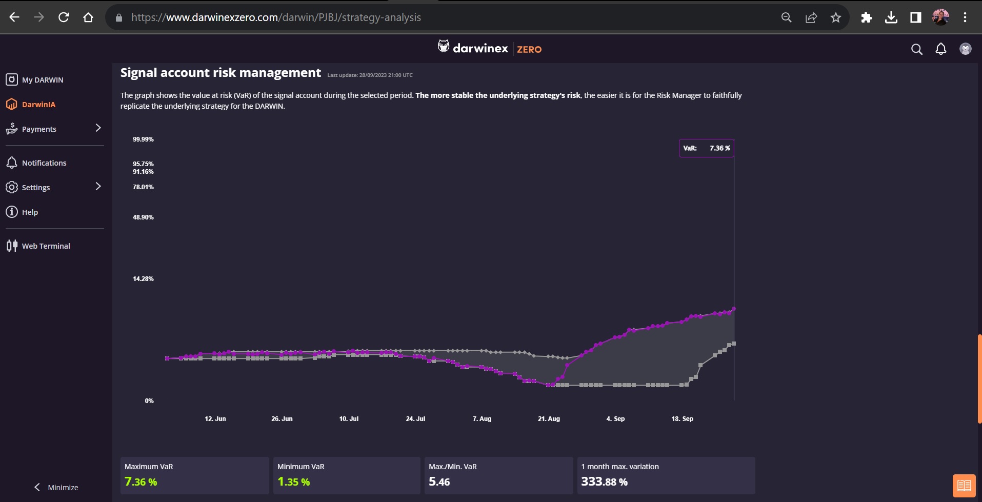 Après 48h de réflexion profonde sur le sujet, j'ai conclu qu'il sera préférable de gérer le Darwin en s'exposant au Risk Manager de Darwinex... donc sans coller la VaR au plafond.