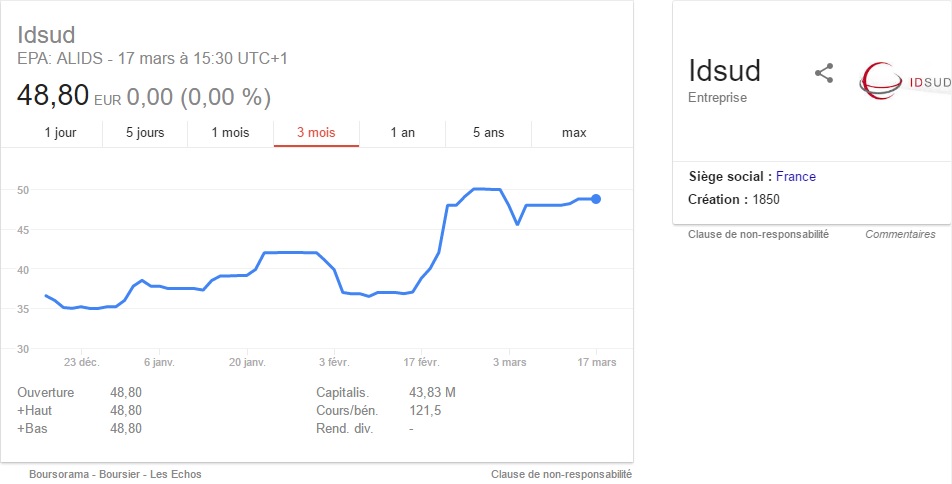 Récemment, la société a pris le contrôle de Nheolis, qui fabrique des petites éoliennes, et l’a rebaptisé Idsud Energie. Je reste très dubitatif sur le capital développement d’Idsud au vu des mauvaises performances passées. Je n’en attends rien pour la revalorisation du dossier mais heureusement, l’essentiel n’est pas là.