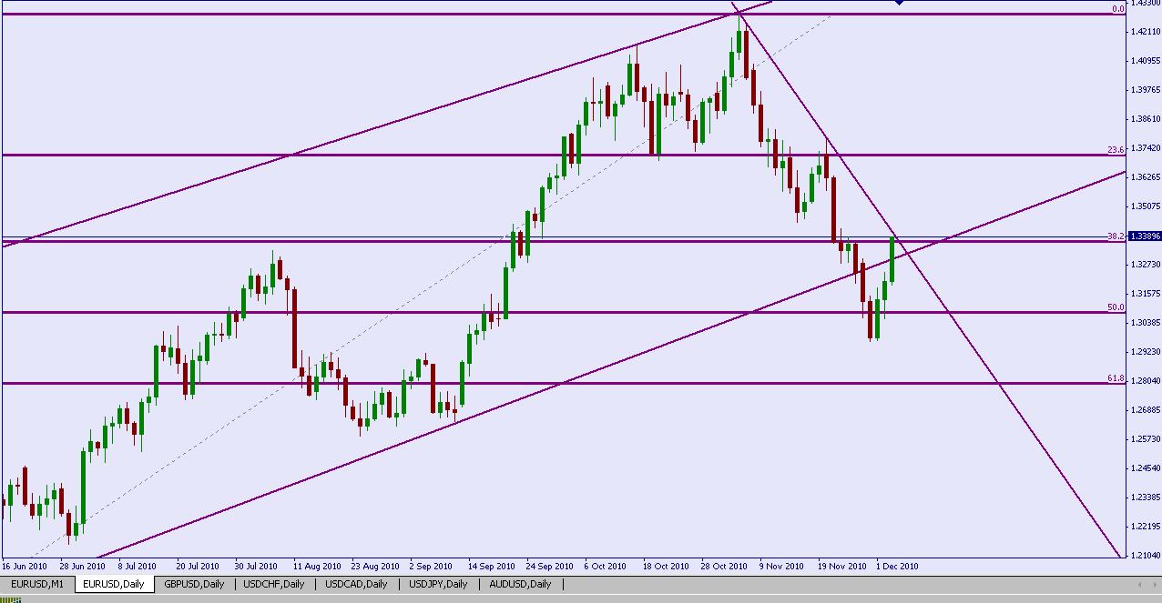 Short EUR/USD à 1.338, SL 1.348 TP au dessus du retracement de 50% du mouvement haussier de juin à début novembre à 1.3110.