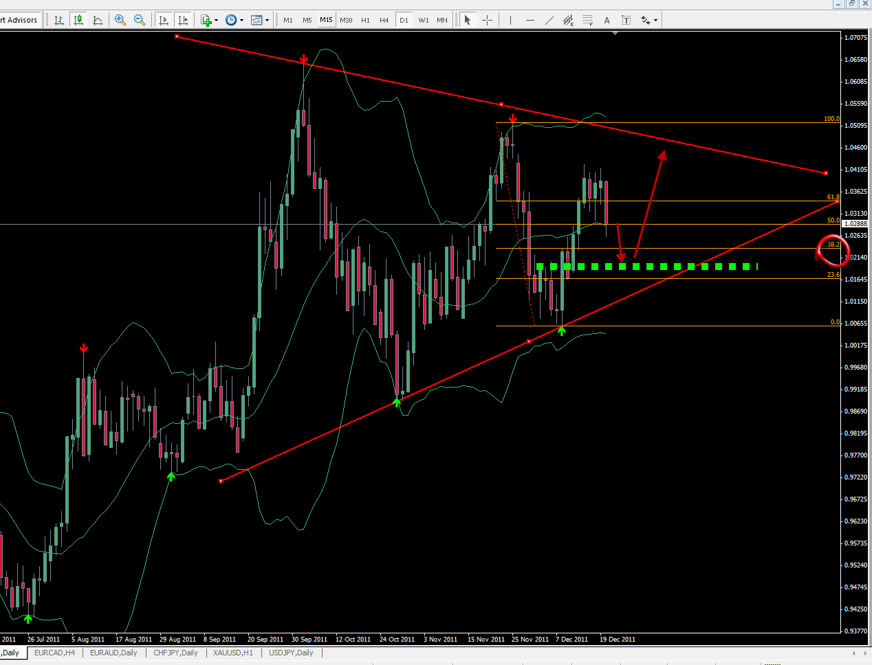 Pour du moyen terme, et là je suis plus confiant, prise de position sur cassure à la hausse du triangle, sl sous les plus bas du 8 décembre (1.0040 par exemple) et tp au niveau des 38.2% de retracement de la dynamique baissière observée depuis mars 2009 (1.079).