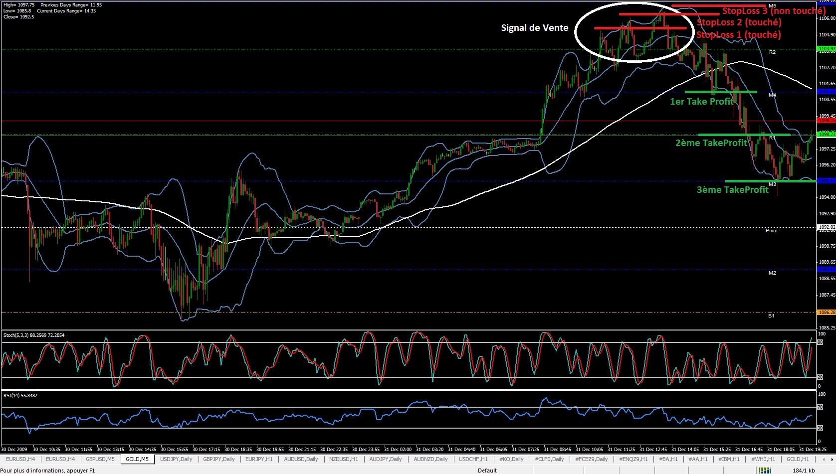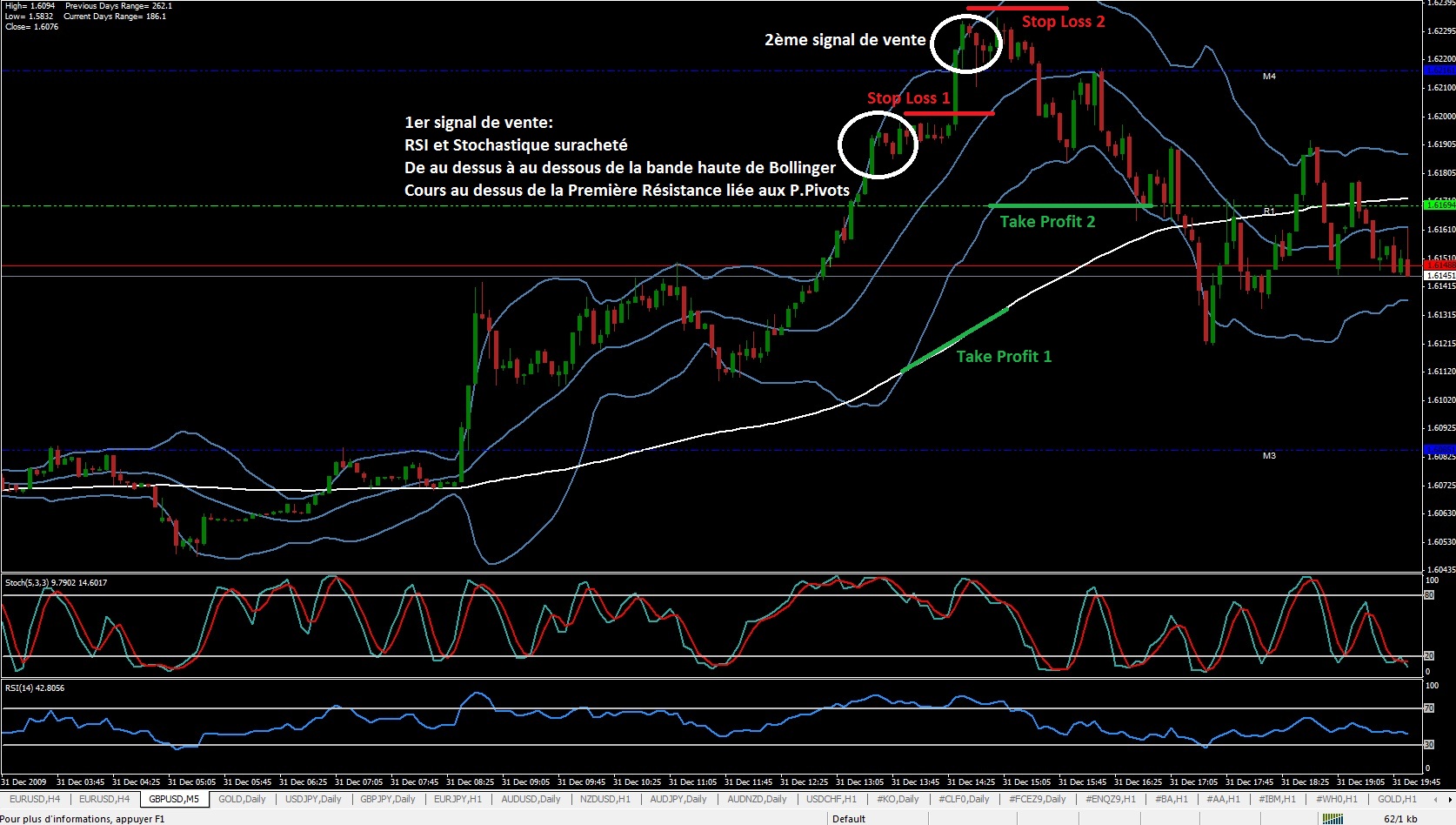 Permet de profiter du dynamisme d'indicateur comme le stochastique tout en filtrant un maximum de faux signaux avec les Points Pivots, les bandes de Bollinger et le RSI.