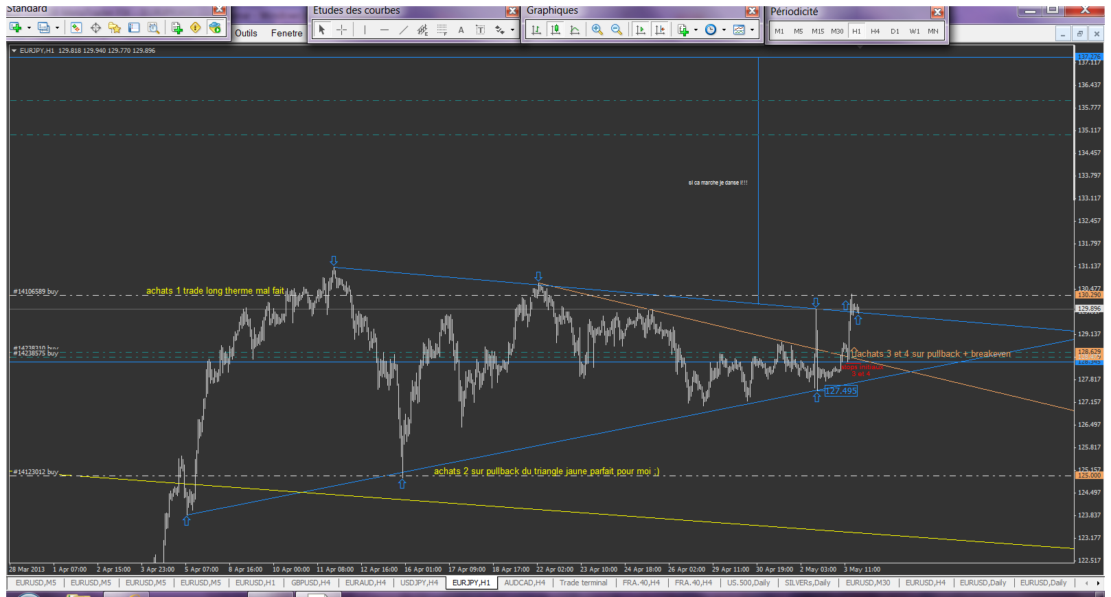 alors voila j'ai agit sur l'eurusd. la j'ai vraiment respecté ma facon de faire aves intervention au bon moment.meme si ca échou plus tard je peu déjà etre content de moi. j'ai plus qu'à attendre mon objectif2.