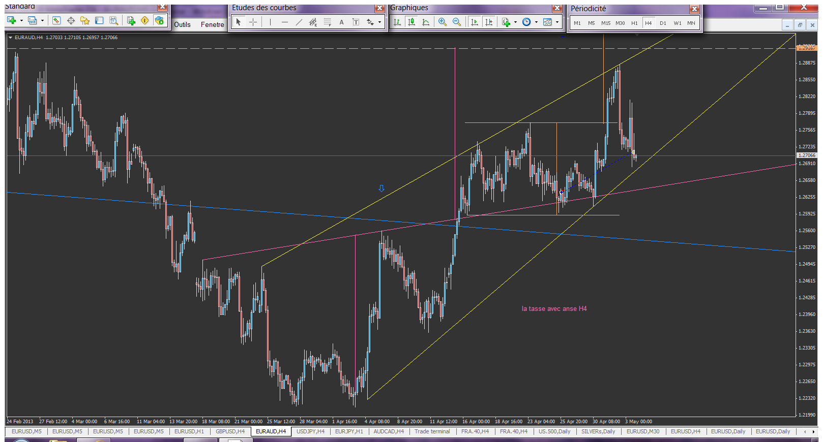 sur l'euraud j'ai fermé mon trade, car vous l'avez vu j'ai mis une forte dose de trade sur l'usdjpy et sur l'eurjpy, pourtant, ma tasse avec anse reste clairement valide, mais si le biseau était cassé alors faudrait que j'agisse(cela dit pas avant d'avoir fermer mes autre position). je conseil pas de faire comme moi, d'ailleur, le conseil que tu met 4b4z , sur la taille des positions me rappel que trop de position tu les positions lol! voila pourquoi j'attendrais un peu avant de me repositionner sur cette tasse ou sur ce biseau