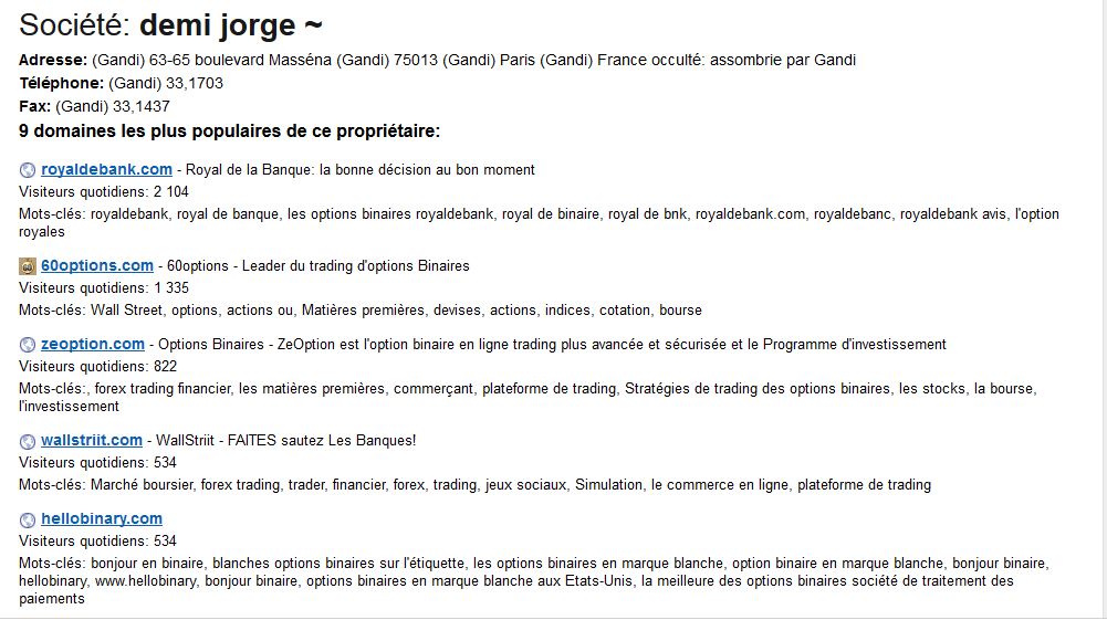 Pour zeoption nous pouvons trouver un nom "DEMI JORGE" son nom apparait dans de nombreuses société spécialisé dans les options binaires; pour certaine il fallait osé les nommer ainsi.Marc RAFFARD a écrit :J'ai fait des recherches et je les partage donc avec vous.