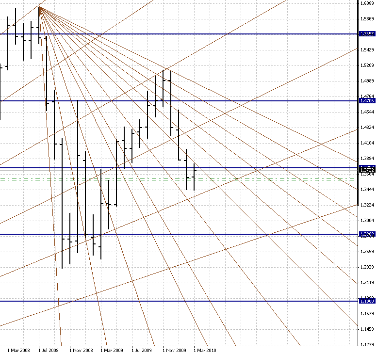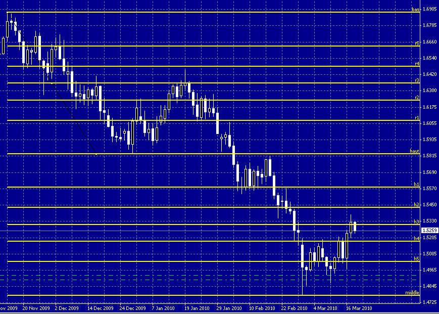 Pour les points d'entrés et sorties, j'utilise par exemple en ce moment sur l'eurodol, 3 tracés baissiers et 2 tracés haussiers pour l'intraday. Je me sers des 9 trenlines sur les 9 UT avec les 6 zoom, soit en l'occurrence 2430 trenlines! Ne pouvant suivre les 54 graphiques en même temps, j'ai formulé sous excel afin d'obtenir les points à une échance donnée. J'obtiens donc une liste importante de chiffres dont je retiens uniquement ceux étant à + ou - 300 pips du cours à l'instant T. J'interviens quand j'ai un signal sur une zone avec un autre indicateur.