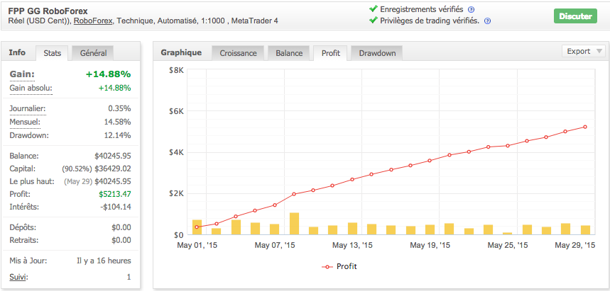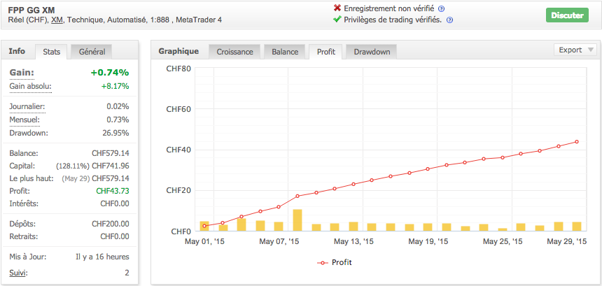 Rendement s/capital déposé : % 17.37Voici un premier pointage après quelques jours.FullPips a écrit :Dans le but de faire un essais comparatif en parallèle, j'ai ouvert 3 nouveaux comptes :