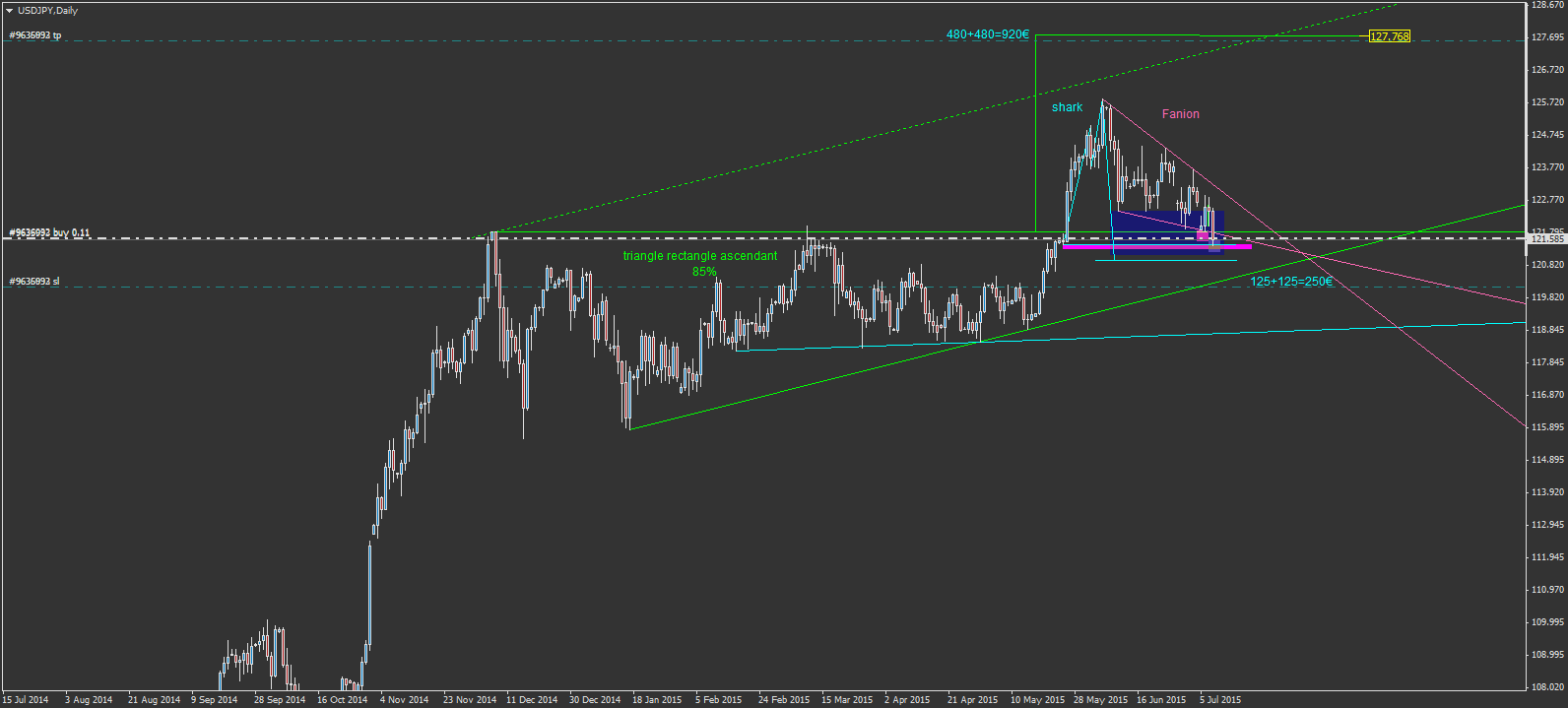 sur ce pétrole, le stop est embêtant, je préfère le pullback en harmonique du usdjpy qui a permis de revenir sur le support du triangle, car plus d'expérience visuel sur les triangle, car c'est sur les triangle que j'ai compris ce type de piège à stop. ca marche aussi sur les autres figure, mais quand le stop est trop large par rapport à l'objectif, alors je préfère m'abstenir. en effet, si le stop le plus sécuritaire donné par la configue, est en plus court pour un objectif élevé, alors c'est mieux pour moi.