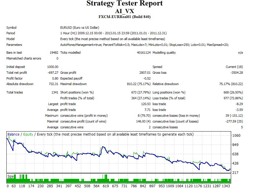 Entre le 200ième et le 1630ième trade sur le backtest depuis 2010, ton EA reste essentiellement flat. Pas cool. Que se passe-t'il en 2009, 2008, ... etc ? Un EA avec un algo intelligent (ça j'ai pas pu voir) et censé qui marche depuis 2 ans et demi, c'est toujours pas si mal cependant.