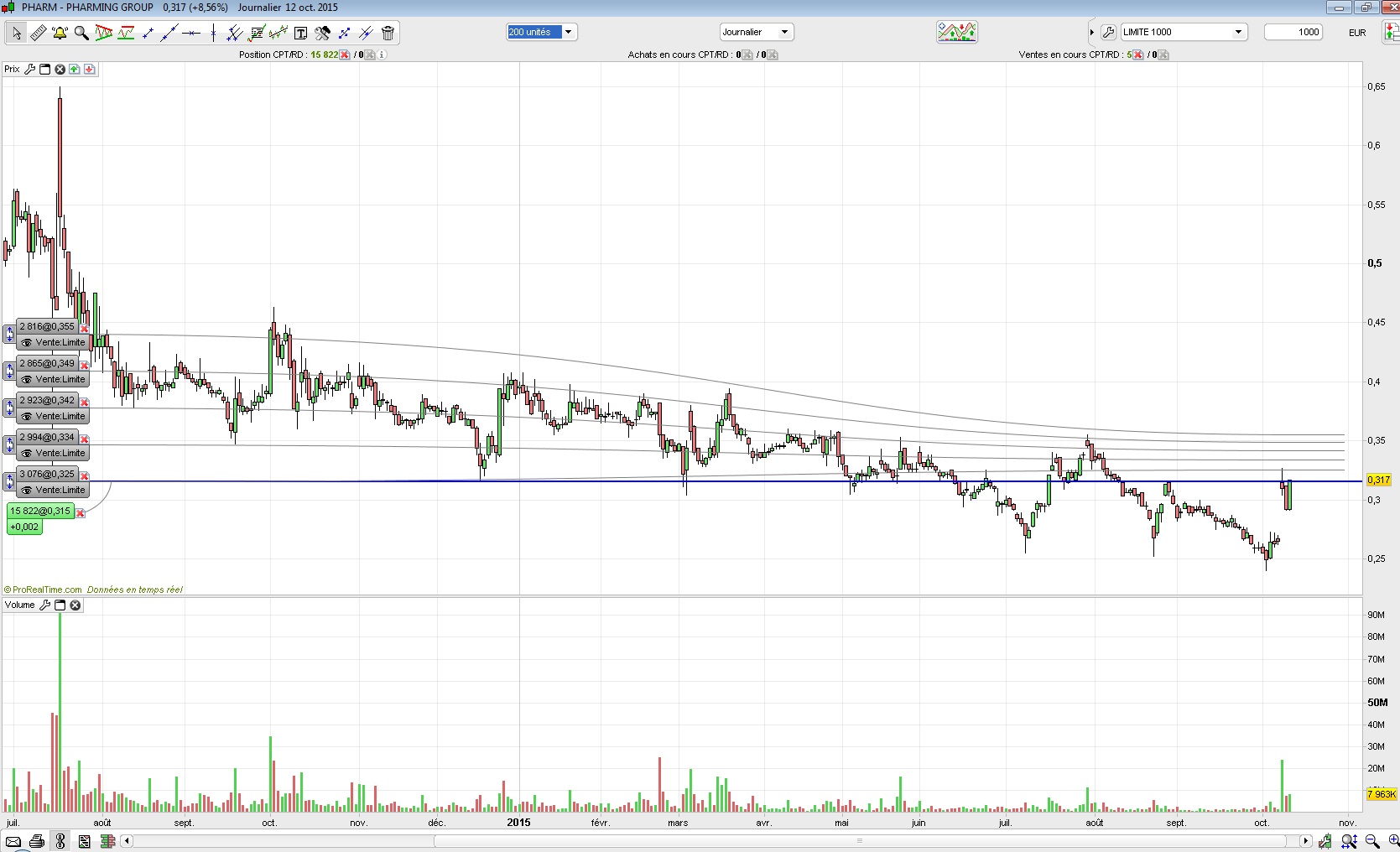 Du coup j'ai acheté vers 14h l'action Ontex qui progressait bien, avec des échanges de plusieurs millions sur la journée, et des volumes quotidiens étoffés sans être excessifs. Malheureusement après mon achat on s'est un peu replié, mais rien de grave. J'ai donc placé mes 5 ordres de sortie tous les 2% pour lundi:
