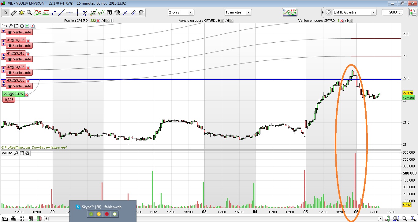 Ensuite, on passe à l'étude du graphique 15 minutes pour étudier le comportement des investisseur au cours de la séance écoulée (exemple avec ma position du jour):