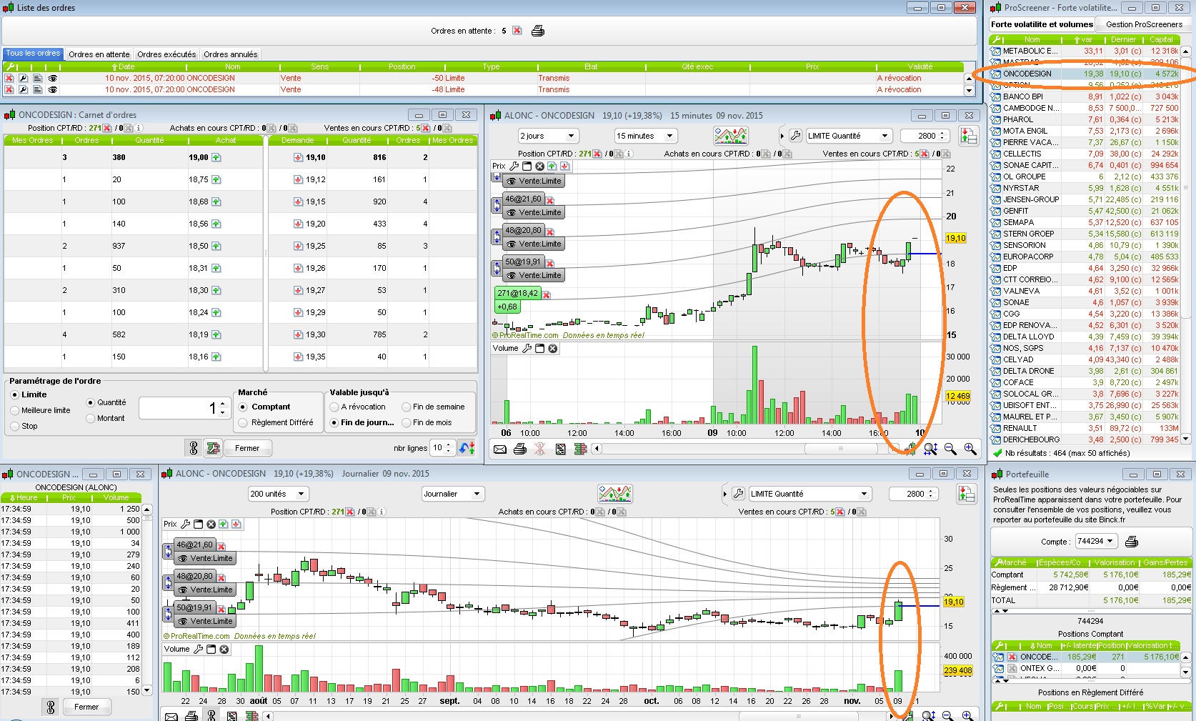 Ce jour j'ai acheté le titre ONCODESIGN pour 5000€. L'action montrait une forte hausse dans des volumes étoffés mais pas excessifs sur le journée, et un bel engouement en fin de séance, en terme de hausse et de volumes. Les critères étant respectés, j'ai acheté, le titre a d'ailleurs continué à monter avant la clôture et a réalisé un beau fixing: