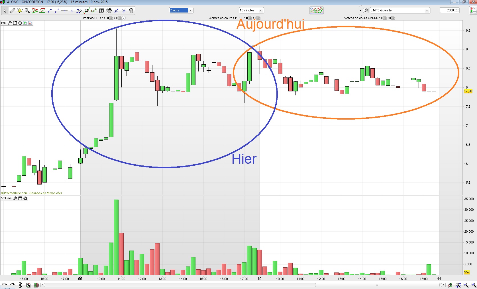 On regarde donc ici comment s'est déroulée la hausse. Idéalement on recherchera un fort engouement en fin de séance qui permet de terminer sur ou proche des plus hauts avec de forts volumes, ce qui traduit un fort intérêt.