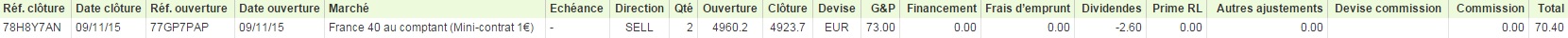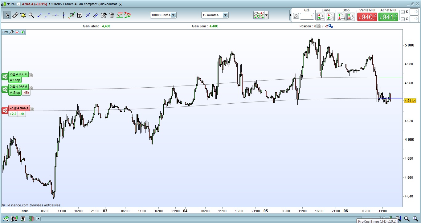 Ce jour a été mauvais pour la stratégie basée sur le suivi de tendance à partir du breakout de la première demi-heure de cotation. En effet cette journée a vu le cours partir dans un sens puis dans l'autre. les deux stop loss ont étés touchés: