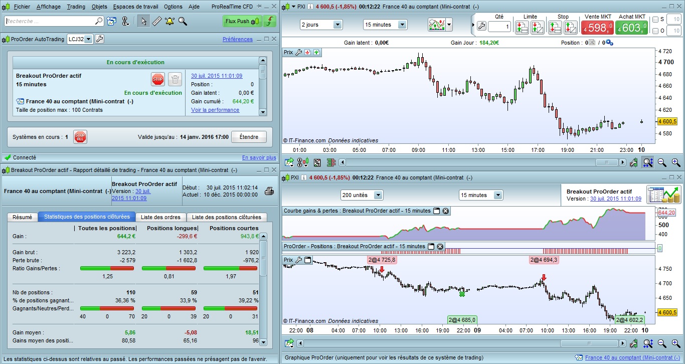 Oui tu peux tout à fait couper une position en plusieurs fois, mais attention, il faut respecter la taille de position minimale imposée par le courtier. Par exemple chez IG via l'offre ProRealTime CFD, la taille de position minimale sur le mini CFD CAC 40 est de 2€ du point. Donc tu peux par exemple prendre une position initiale à 6€ du point et la fermer en 3 fois 2€ du point.Rednef a écrit :par contre as tu une solution sur PRT pour pouvoir couper des parties de position (genre 2 contrats sur 3 ) puis couper le dernier plus tard.