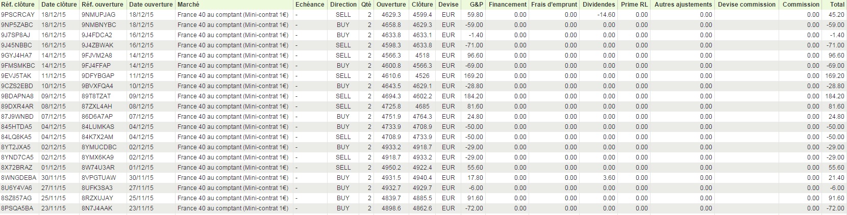 Voici:On notera un beau profit aujourd'hui, la stratégie ayant pleinement profitée de la tendance baissière intraday:Le compte affiche actuellement 1634€. Belle période pour la stratégie.arcadiabay a écrit :Si c'est possible j'aimerais connaitre les gains par jour de la stratégie sur les 15 derniers jours.
