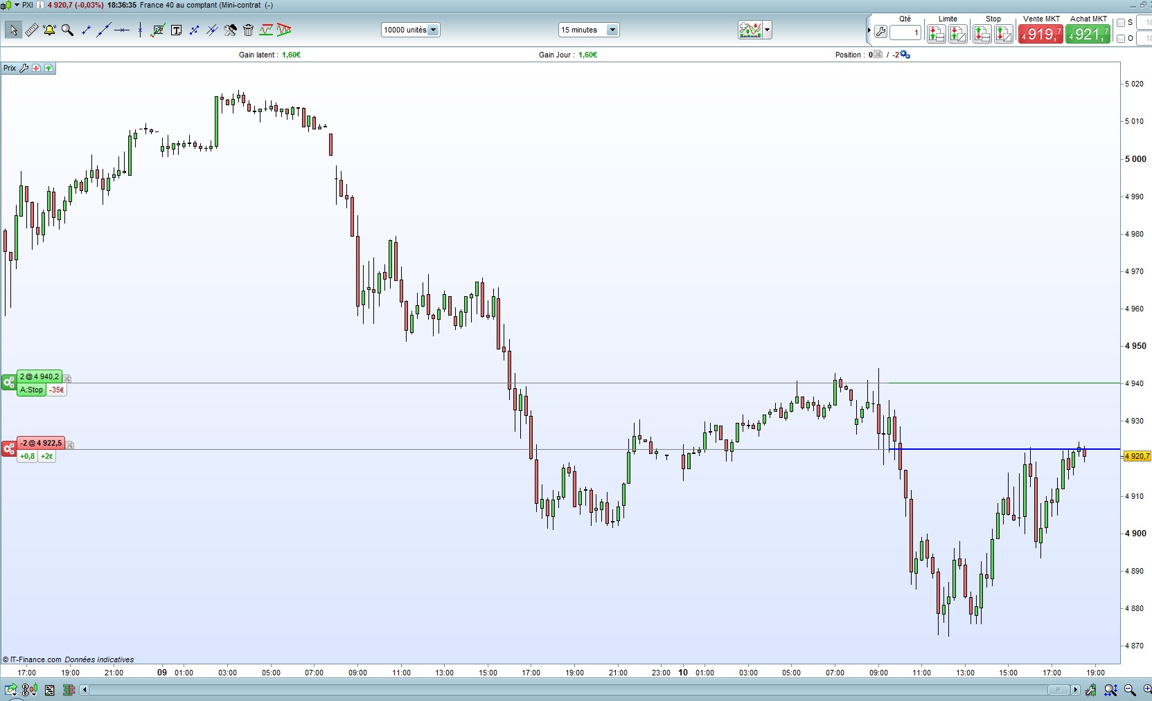 Oui tu peux tout à fait couper une position en plusieurs fois, mais attention, il faut respecter la taille de position minimale imposée par le courtier. Par exemple chez IG via l'offre ProRealTime CFD, la taille de position minimale sur le mini CFD CAC 40 est de 2€ du point. Donc tu peux par exemple prendre une position initiale à 6€ du point et la fermer en 3 fois 2€ du point.Rednef a écrit :par contre as tu une solution sur PRT pour pouvoir couper des parties de position (genre 2 contrats sur 3 ) puis couper le dernier plus tard.