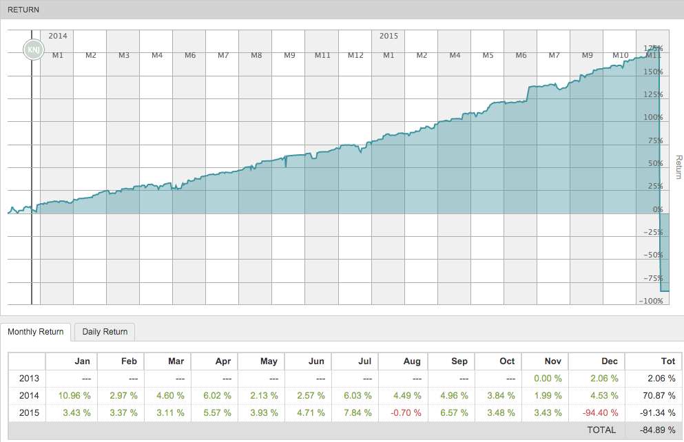 Si vous observez les résultats mensuels, vous constaterez que l'algo booste notablement le résultat sur le Darwin, et lorsque le trader fume le compte, il protège le Darwin qui s'en sort avec un DD raisonnable.