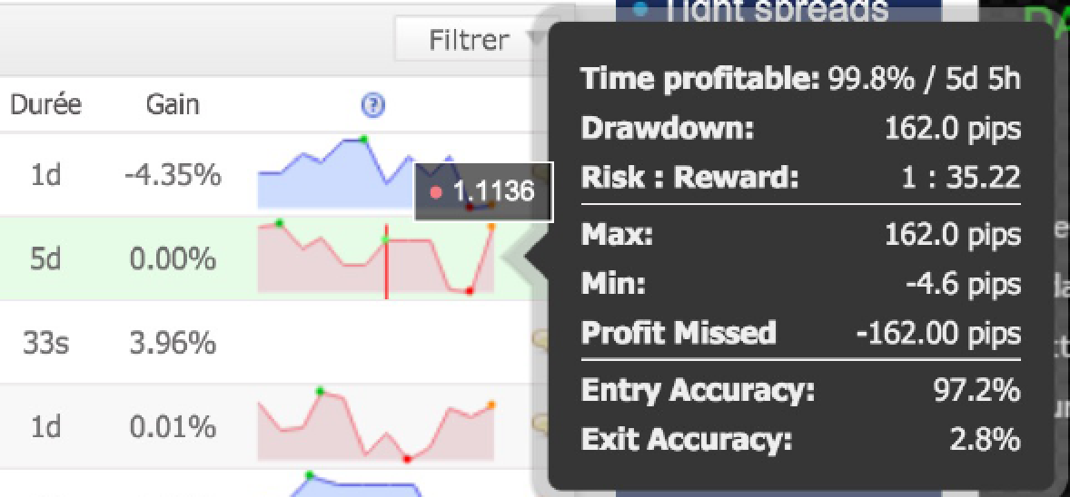 MyFxBook nous offre un super outil d'analyse qui se trouve tout à la fin de la ligne, si vous passez votre souris sur le petit graphique.