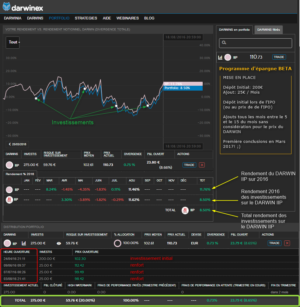Le DARWIN sera donc bien plus dynamique, il affiche d'ailleurs actuellement quasi 2x plus de rendement que la strat sur la section importée, soit depuis le 28 Mars 2016.