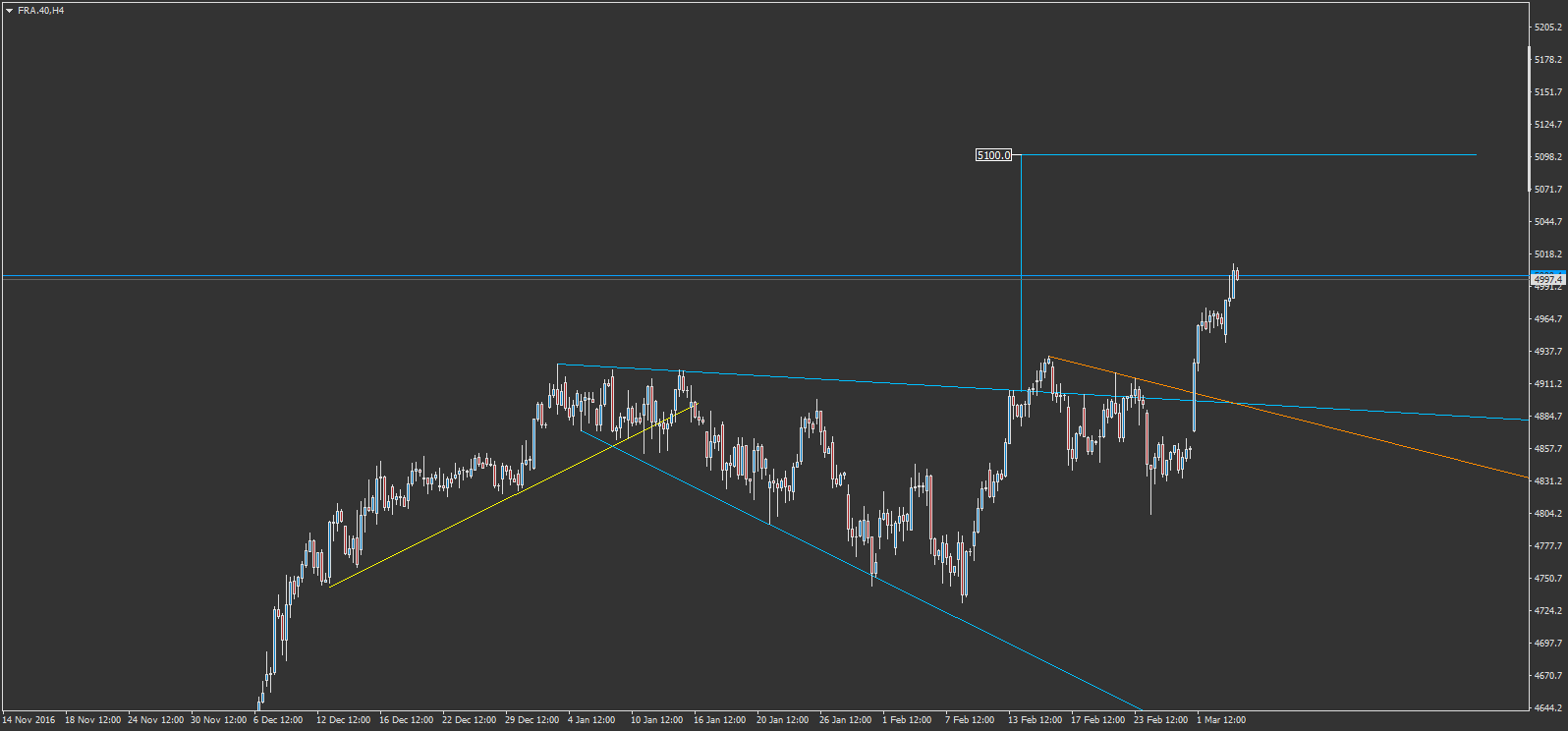 tien, sur le FRA.40 on a un biseau d'élargissement descendant cassé à la hausse. l'objectif théorique est à 5100.0 mais y a des chances de revenir sur la figure avant d'aller éventuellement à l'objectif.
