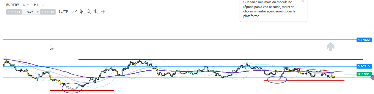 je vous propose de surveiller la paire EURTRY sur laquelle il y aura une opportunité à l'achat pour l'instant rien n'est défini ( :!: les moyennes mobiles sont sans tendances)..