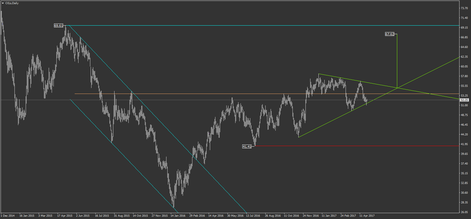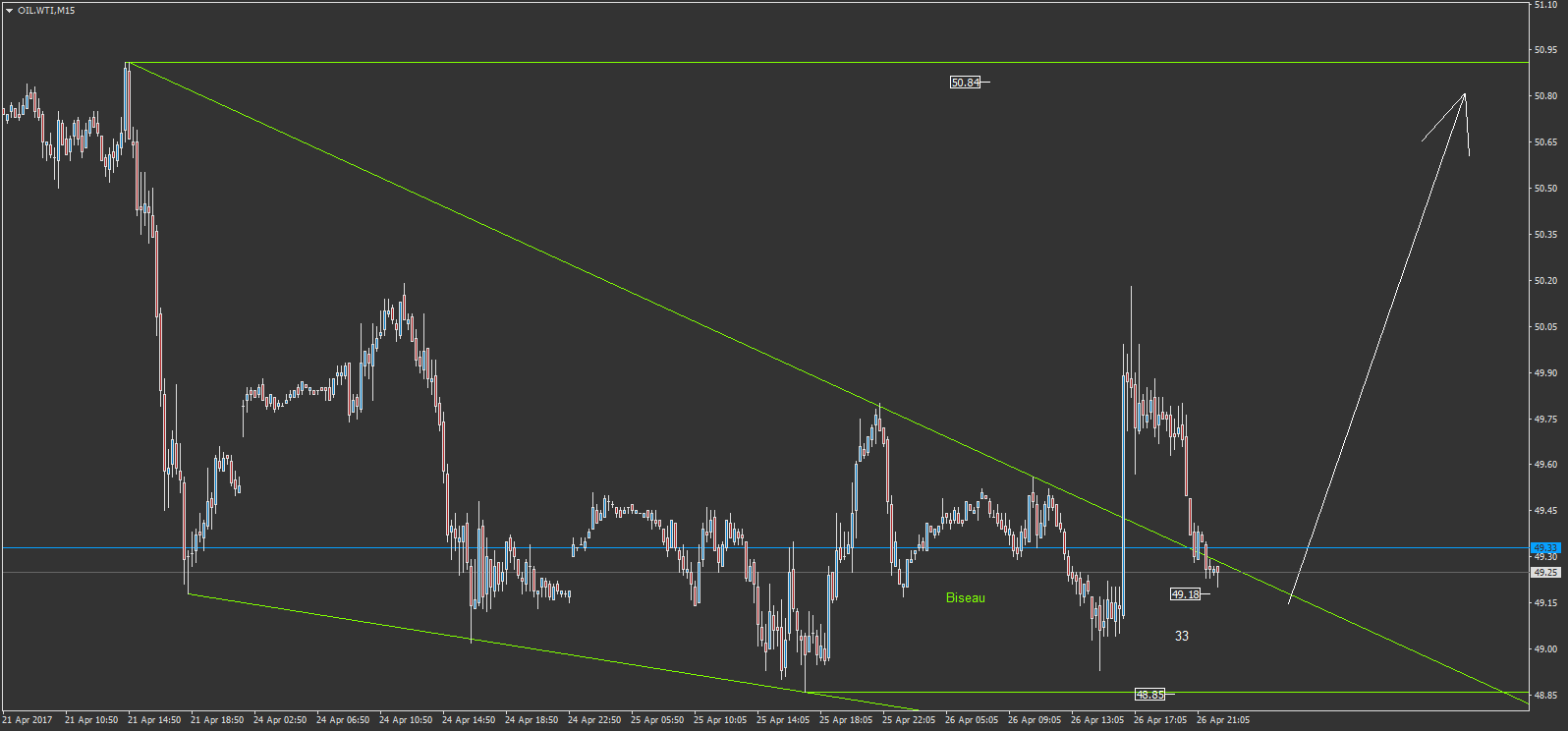 voici sur le Pétrole, un biseau descendant. si on redressant sur 49.18 alors j'entre à l'achat stop à 48.85 et objectif à 50.84