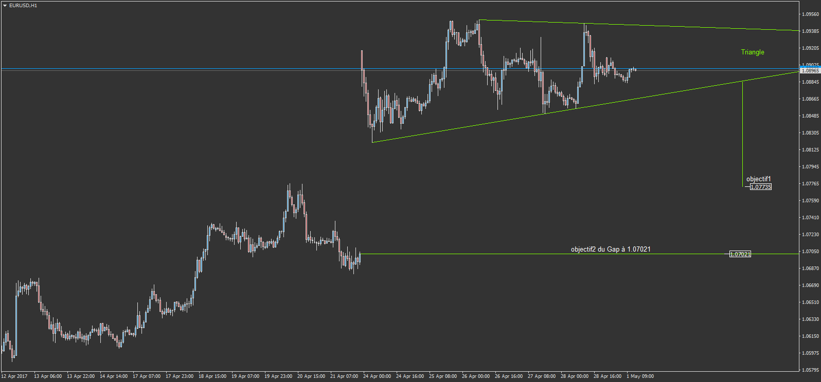 Avant le FOMC de 20h en ce mercredi 03/05/2017 et bien l'EURUSD est toujours dans son triangle symétrique. seul une cassure baissière me donnera une idée baissière avec pour but de reboucher le gap. mais l'objectif1 à changé et est plus court à 1.07970