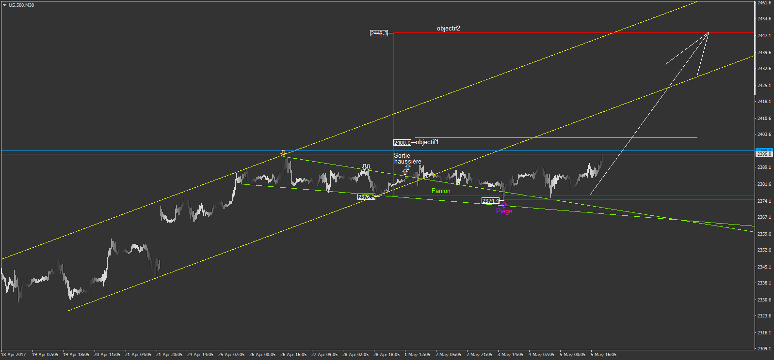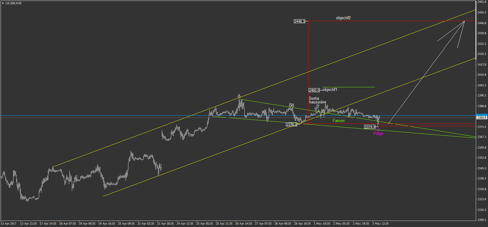 Probable piège sur US.500 mais attention, il y a le FOMC et la politique monétaire de la FED à 20h en ce 03/05/2017 autant ne rien faire d'ici là!!!! pas de point d'entré pour le moment pour moi.