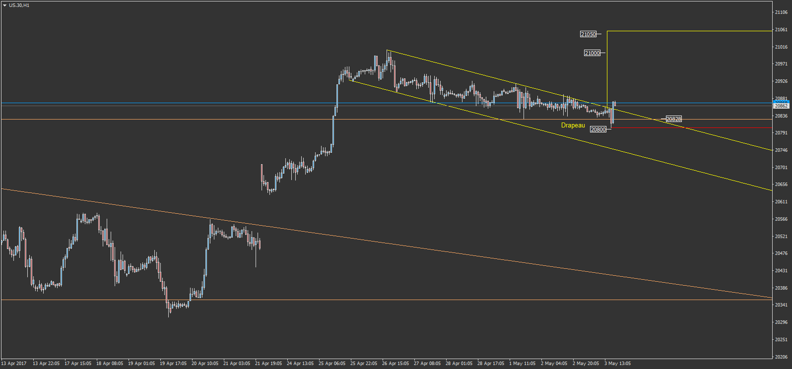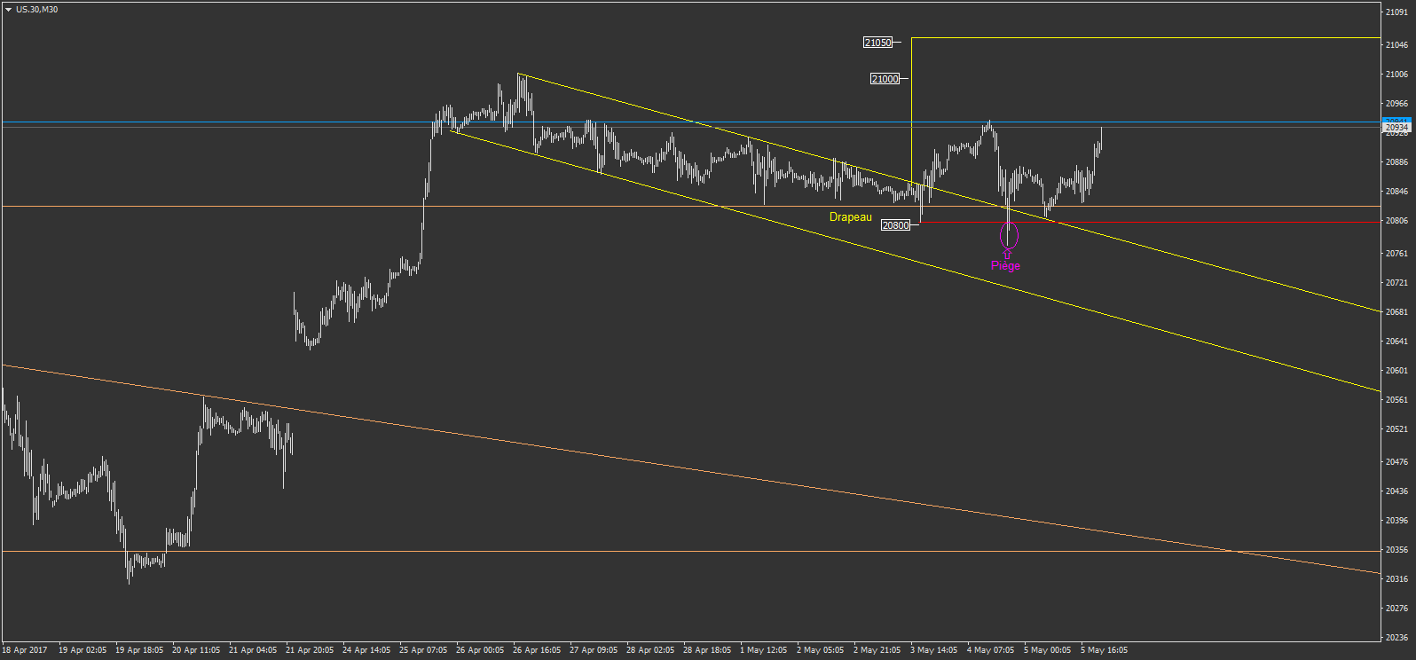 Sur US.30 il y a un drapeau cassé qui donne un première objectif à 21000 et un 2ème objectif à 21050