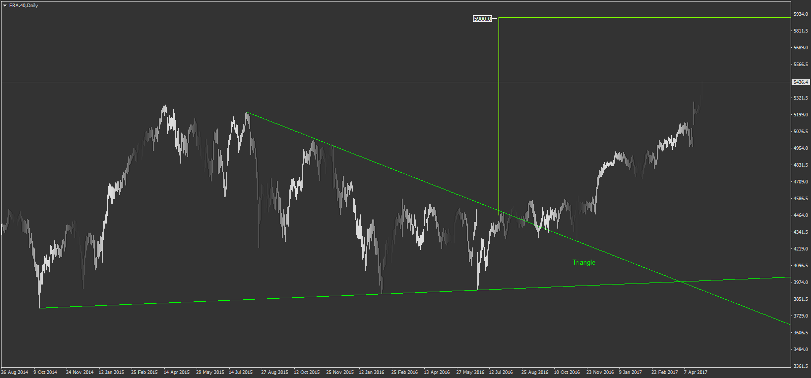 Donc une hausse énorme et accéléré attendu sur les indices. pourtant je ne pouvais pas rester en position ce weekend d'élection française, où sur le FRA.40 (CAC40) on a toujours le gros triangle dont l'objectif devrait être vite réalisé après l'élection de Macron, comme attendu par les maîtres de ce monde (merci pour ceux qui ont compris).