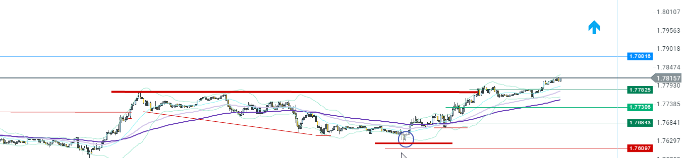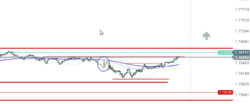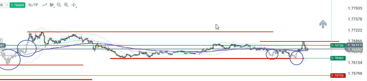 je suis donc descendu sur une UT M1 pour voir un peu l'orientation du cours, je vais considéré le niveau ... comme support sur cet UT, 1.76828, j'ai décidé de remonter mon stop loss au dessus de ma position étant donné que j'ai un volume 0.10 (qui est assez fort pour mon capital)