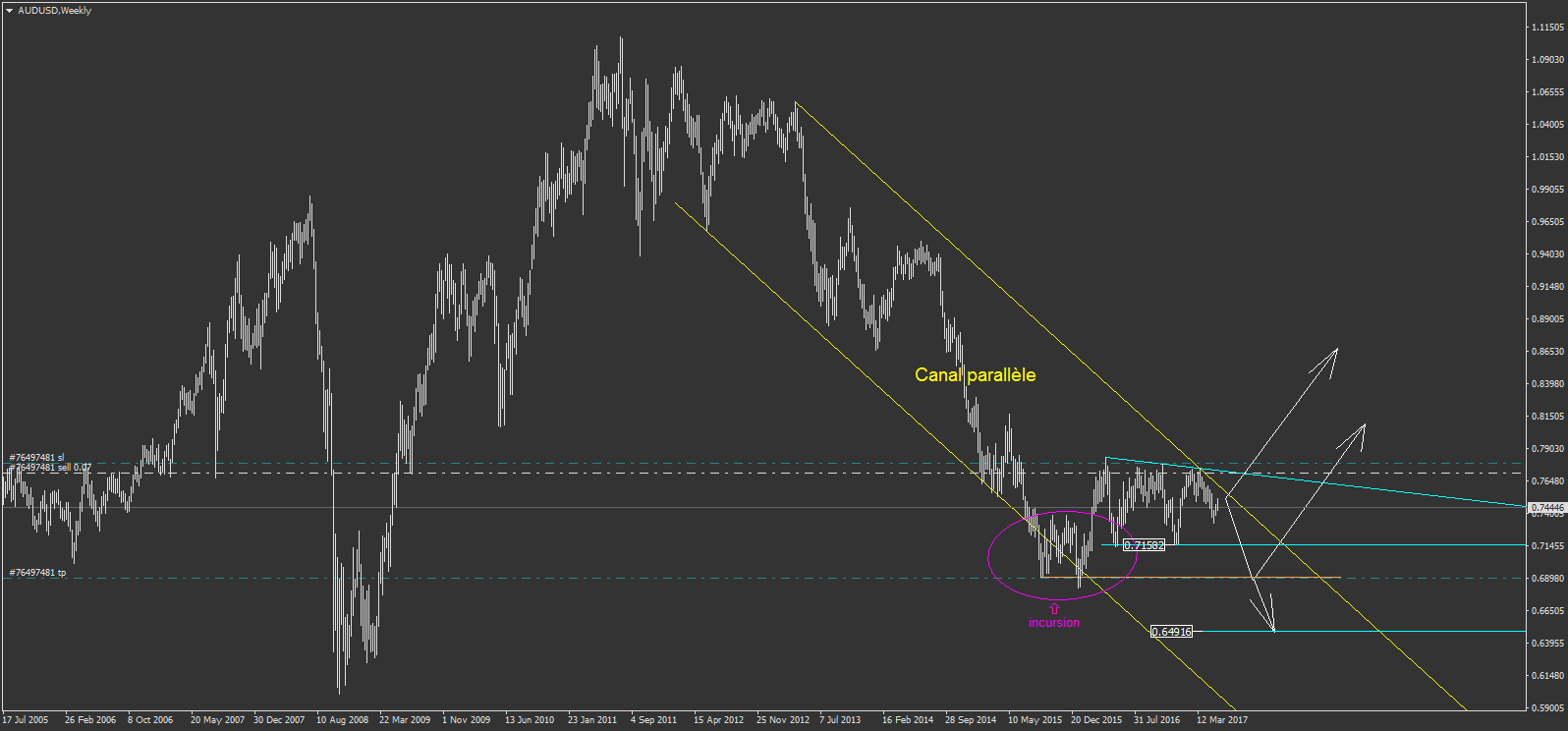 Sur le AUDUSD une analyse me donne un point d'entré sur les niveau proche de 0.74000 à la baisse stop à 0.75000 et objectif du biseau 0.72100