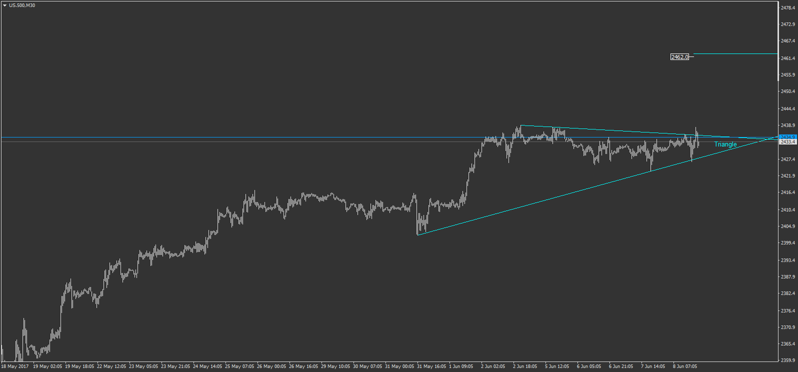 l'objectif théorique est pas loin des 2462.0 par contre, la cassure n'a pas été très franche, et on est déjà revenu dans le triangle.