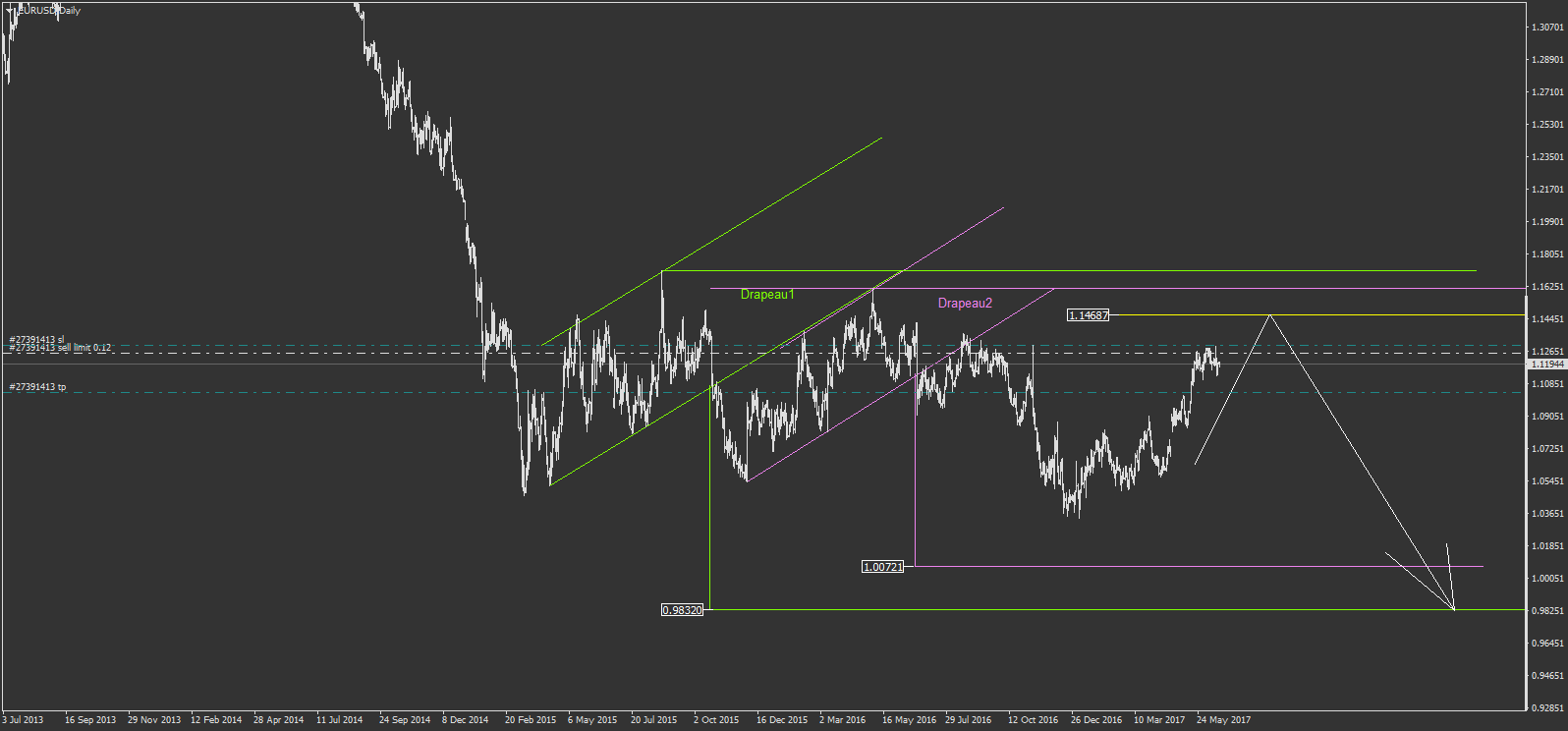 deux formations en drapeau laissent penser depuis un moment à la baisse, mais sans pour autant invalider ces 2 drapeau, on pourrait remonter je pense au dessus même de la ligne rouge que tu as tracée. j'imagine une remonter autour des 1.14687 avant de repartir sur les scénarios des drapeaux baissier. cela dit la hausse actuelle de l'eurusd si elle ce poursuit ne sera pas forcément direct. là je suis à la baisse sur du H1 si jamais on active mon ordre différé. mais ensuite, je pense attendre la formation d'un point d'entré autour des 1.14687 si une ou plusieurs occasions se présente à moi. mais il ne s'agit là aussi que d'hypothèse....Je ne voie pas grand chose d'autre pour le moment sur l'EURUSD.