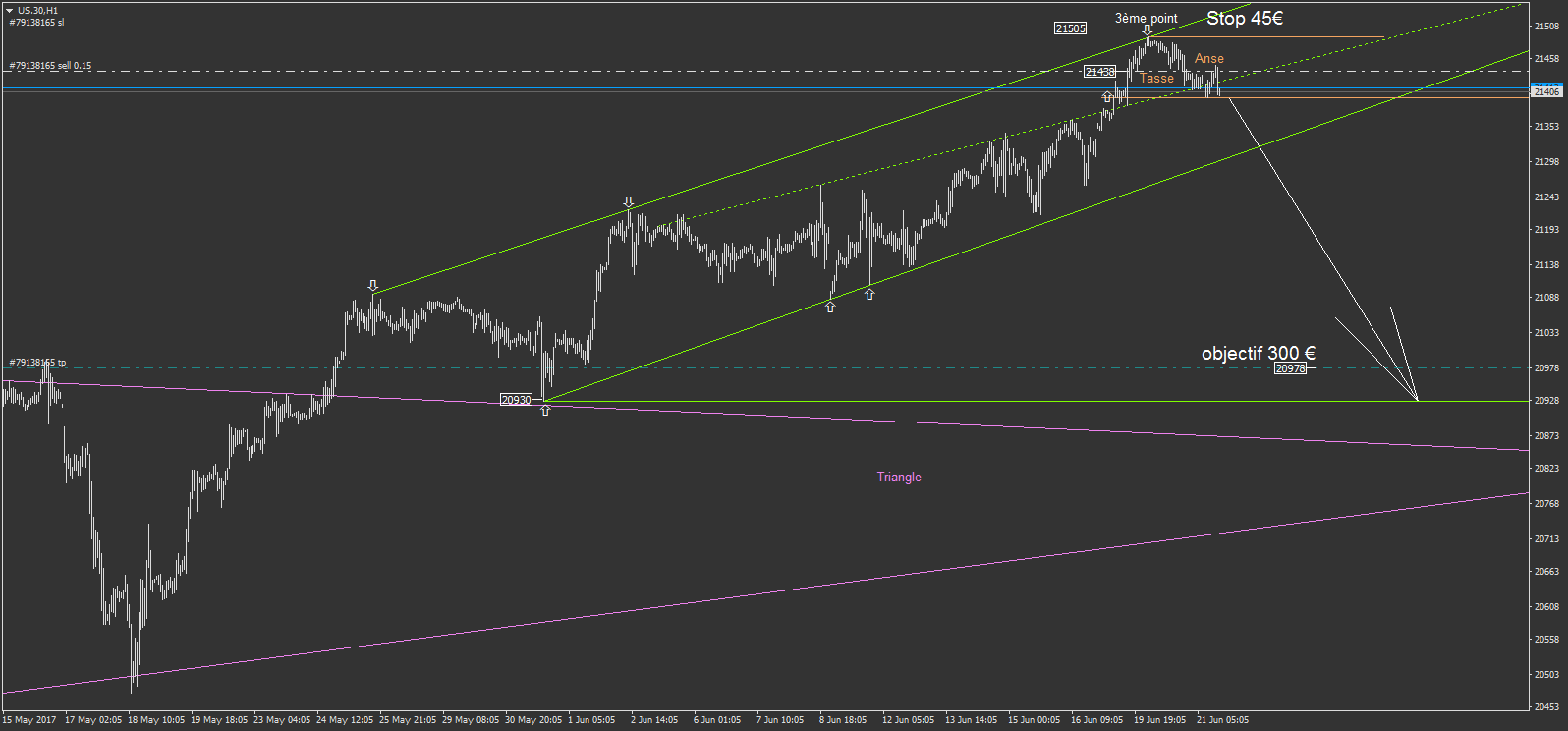 bon, mon trade sur l'us.30 fonctionne. nous voyons sur l'image que la tasse avec anse à fait ces deux objectif. le premier biseau rouge à un gros objectif haussier, mais le replis attendu devrait balayer la validation du biseau rouge si tous ce passe selon mon scénario. attendons de voir. mon objectif est à 300 € sur ce trade.