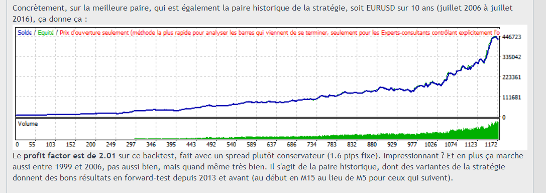Le profit factor est de 2.01 sur ce backtest, fait avec un spread plutôt conservateur (1.6 pips fixe). Impressionnant ? Et en plus ça marche aussi entre 1999 et 2006, pas aussi bien, mais quand même très bien. Il s'agit de la paire historique, dont des variantes de la stratégie donnent des bons résultats en forward-test depuis 2013 et avant (au début en M15 au lieu de M5 pour ceux qui suivent).