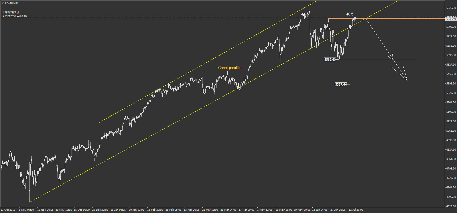 mais sur us.100 je trouve une vision baissière. il y a ce canal jaune parallèle anciennement cassé à la baisse. on revient maintenant sur ce canal, ou j'imagine un possible rebond baissier pour au moins re tester le bas de la cassure vers les 5562.60