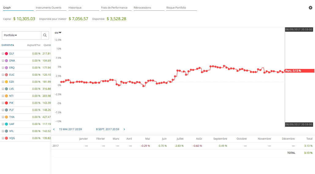 - les rétrocessions sur diversification jouent bien leur rôle de "compensateur" (sur les frais de performance payés au gagnants vs. les pertes des perdants au sein du portefeuille sur 1 trimestre: http://blog.darwinex.com/retrocessions- ... x/?lang=fr) puisque 94$ ont été crédités en rétro vs. 116$ débités en perf. fees.