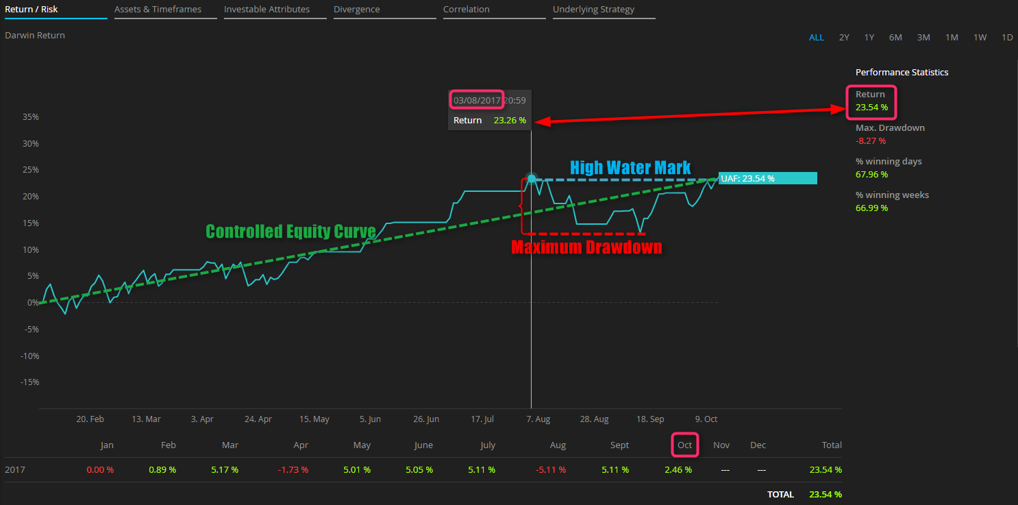 Une étude rapide de la stratégie sous-jacente au darwin UAF permet de voir l'impact de Darwinex en tant que gestionnaire de darwins à travers la notion de D-leverage (cercle vert et rouge).