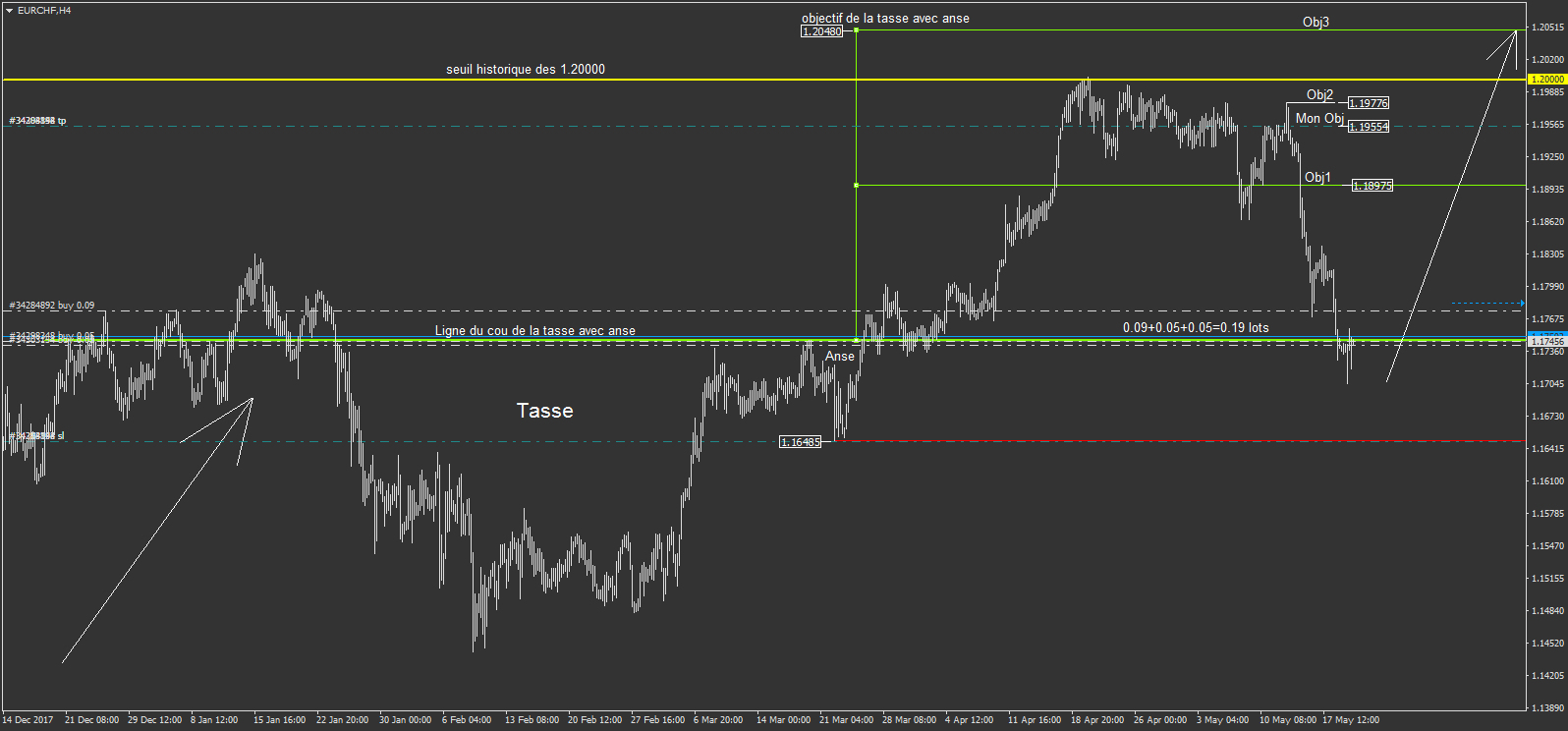 l'EURCHF, le sénario de la tasse avec anse avait raté, mais je n'est pas été stoppé (pour le moment), car j'ai considéré un nouveau scénario.