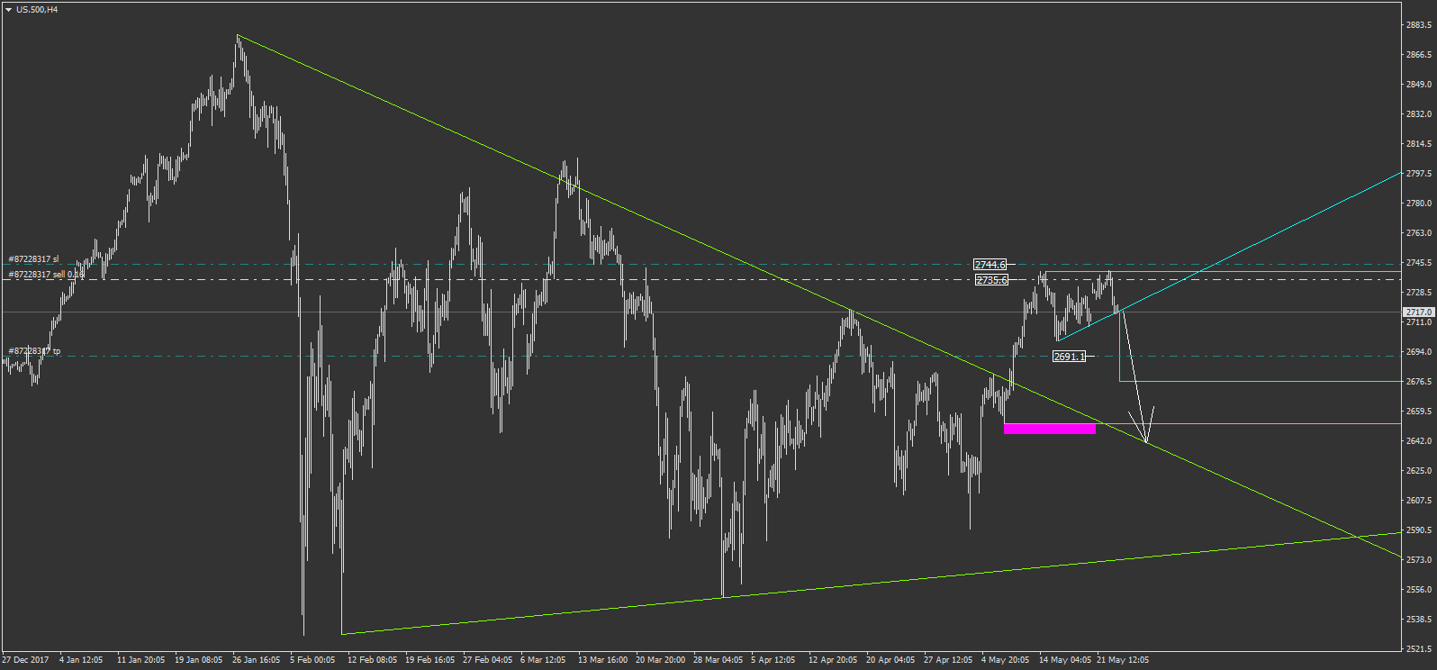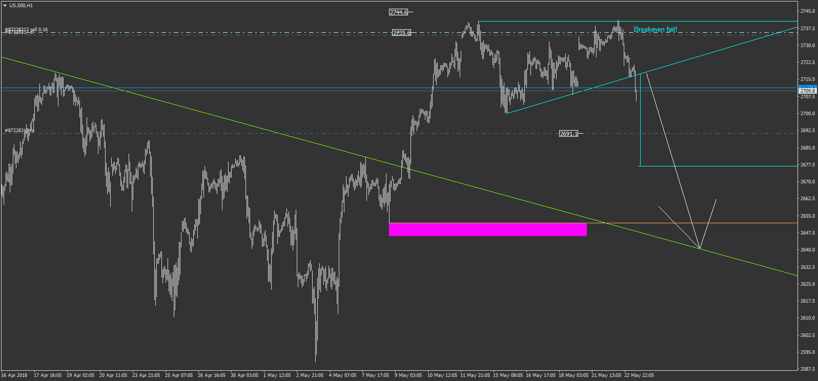 us.500 mon risque est nul désormais grâce au breakeven. j'ai étendu mon objectif à 500 € (2662.1) , considérant toujours un retour possible sur le gros triangle vert. ce serait alors un pullback.
