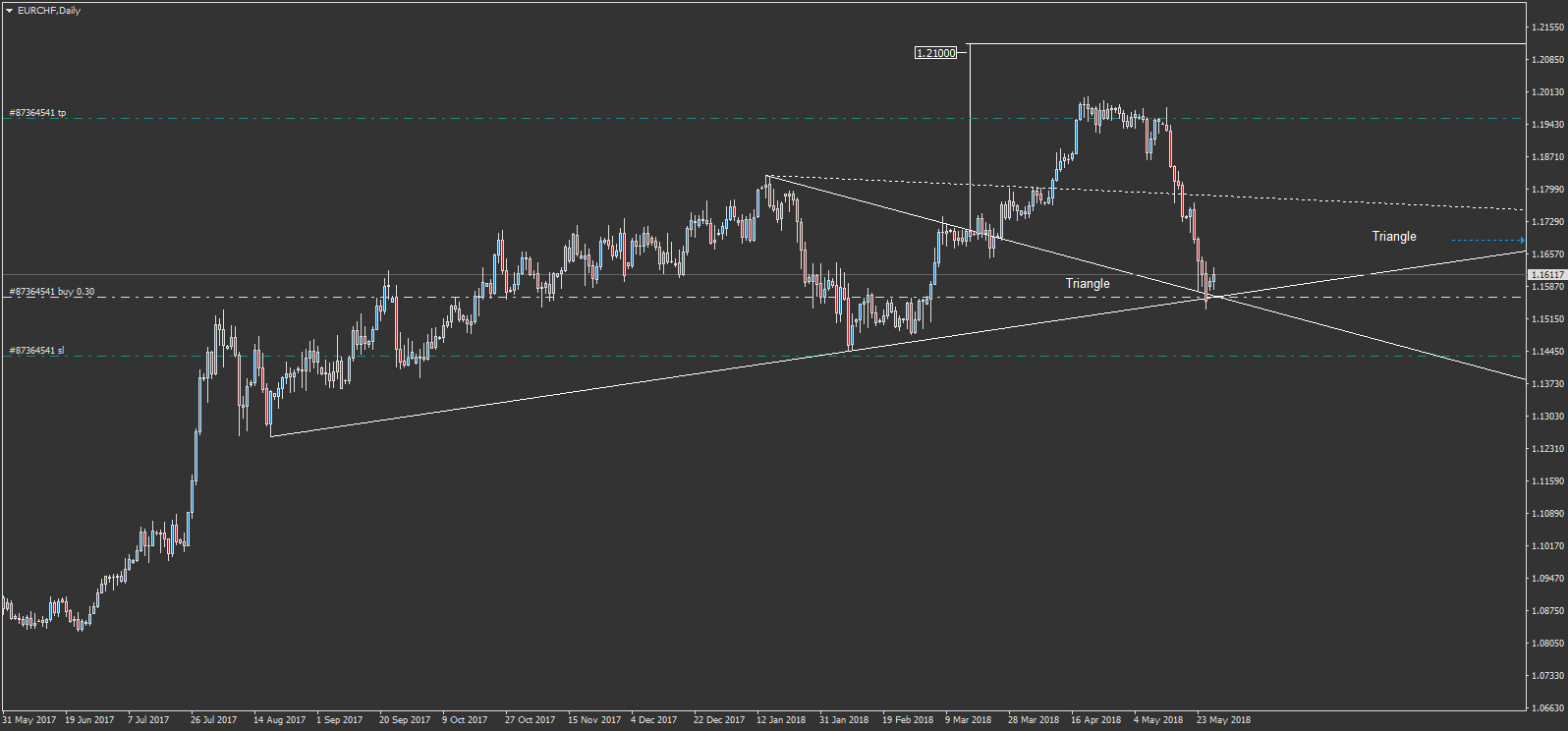 eurchf: je persiste et signe avec un achat sur eurchf et une vision différente avec un triangle qui annonce une hausse, on fait un retour sur le triangle, vers l'apex du triangle. j'ai acheter durant se retour pullback. objectif du triangle vers 1.21000 soit au dessus des 1.20000. mais je m'arrêterais avant surement. à condition que ca monte