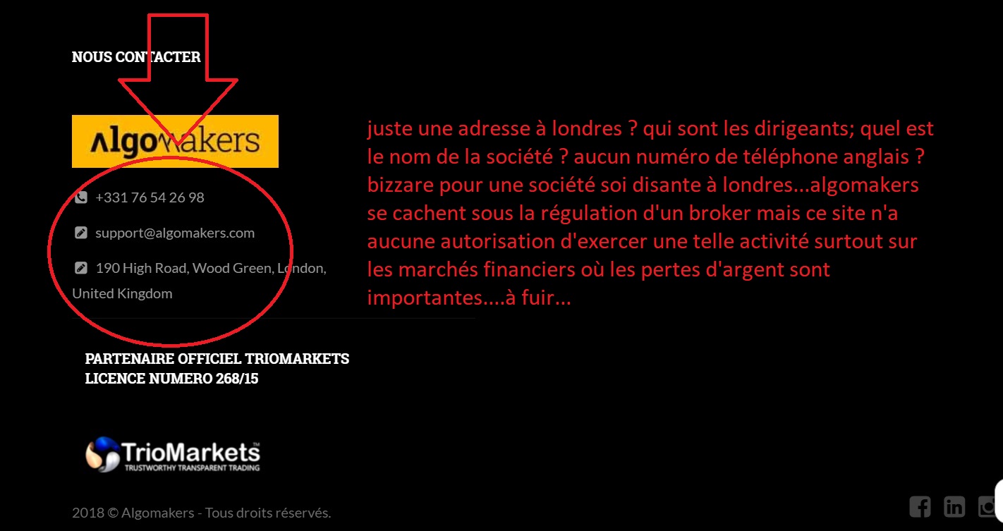 Je confirme bien que le site ALGOMAKERS.COM est une grosse arnaque. Certes ils travaillent avec un broker régulé, mais eux n'ont aucune régulation ni immatriculation. or ce sont bien eux qui sont responsables de leurs robots et non pas le broker. En cas de perte le broker vous renverra vers ALGOMAKERS.COM qui n'a ni adresse à londres mais juste un simple numéro de téléphone virtuel acheté sur internet. en fin de page dans nous contacter un simple email et numéro de téléphone. c'est comme si moi je vendais au noir des robots pour FXCM en disant qu'il est régulé, alors que le robot n'est pas vendu par FXCM. en gros ils se moquent du monde pour rester poli. et ils osent dirent qu'ils sont transparents !!