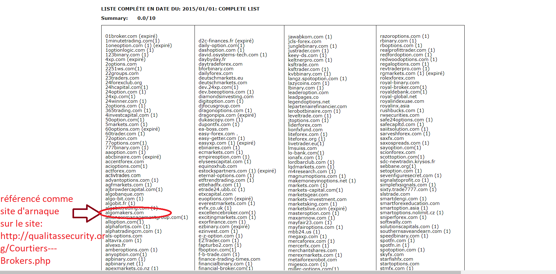 Par contre ce site que je ne connaissais pas (http://qualitassecurity.org/Courtiers---Brokers.php), ne m'a pas l'air fiable. Il place quasiment tous les sites de services / brokers relatifs au trading dans cette liste, y compris de très grosses sociétés régulées.sebdunet a écrit : algomakers référencé comme site d'arnaque sur: http://qualitassecurity.org/Courtiers---Brokers.php