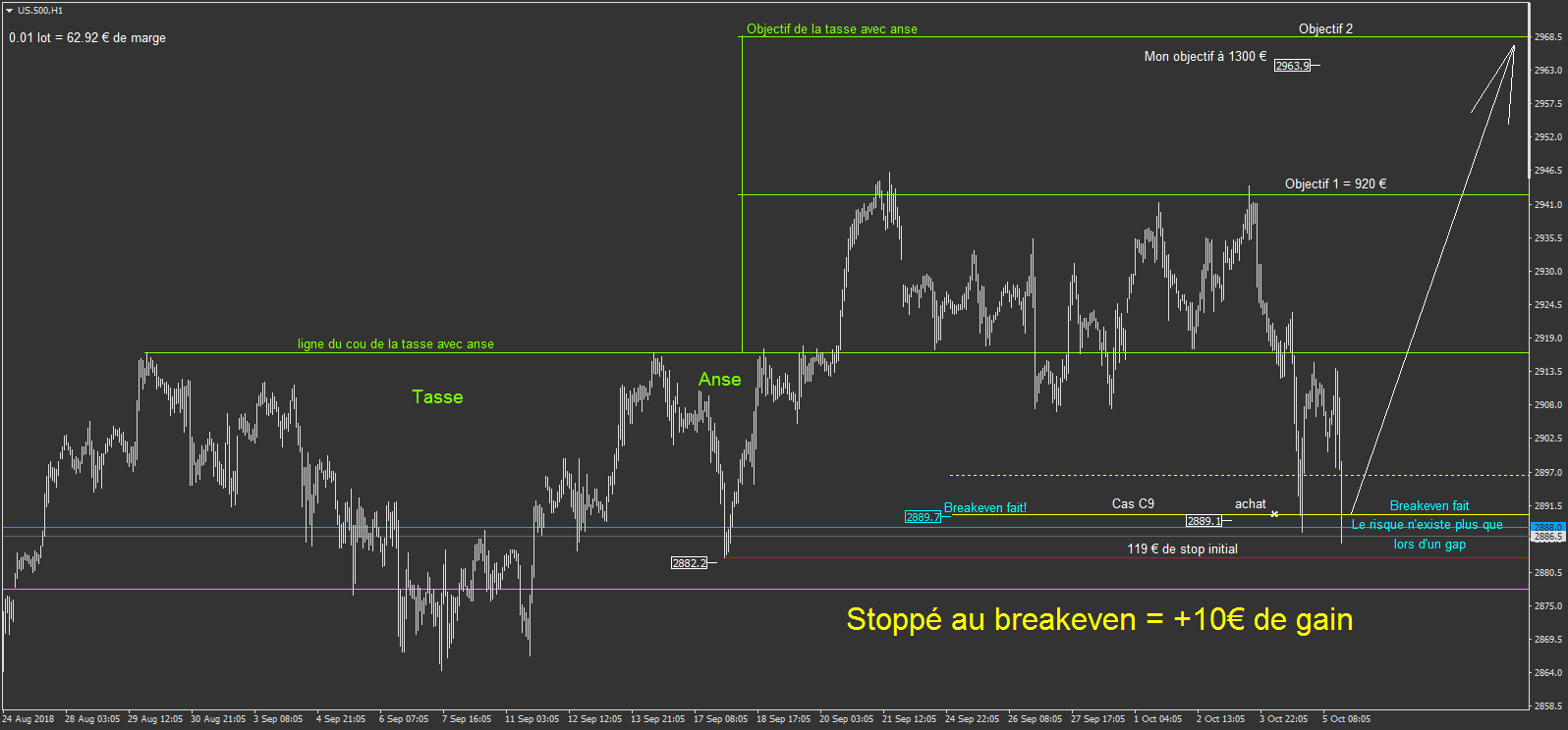 US.500 je viens de faire le breakeven, c'est à dire que j'ai positionné mon stop à 10 € de gain. je ne risque plus de perdre de l'argent en dehors des gaps.