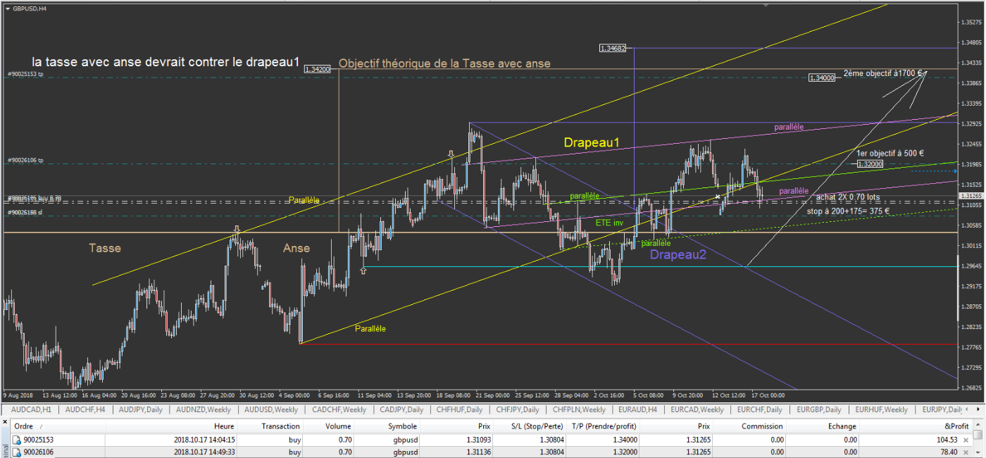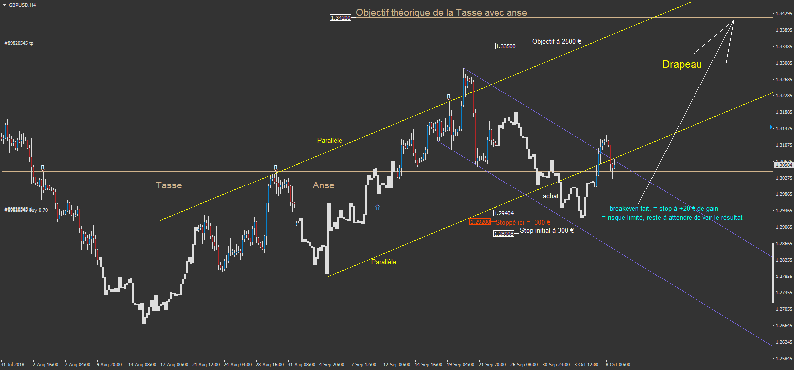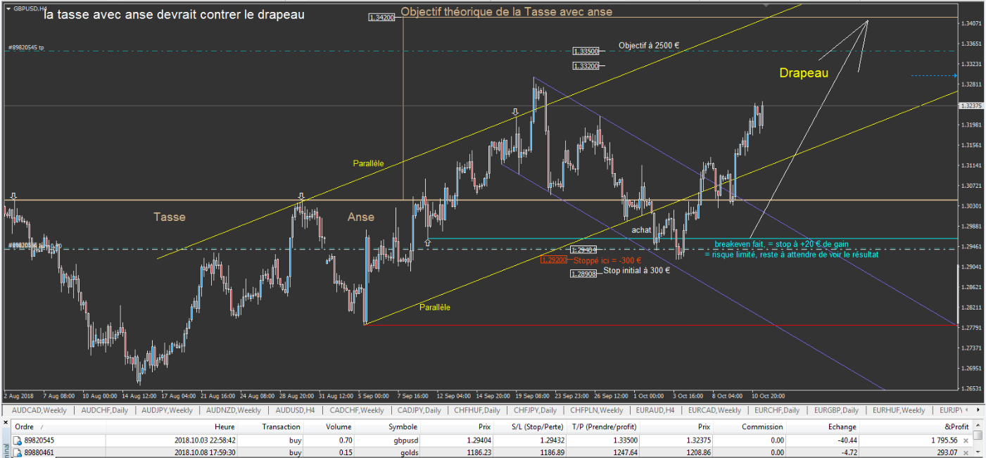 on voit que j'ai acheté alors que le canal jaune qu'on peux concidéré comme un drapeau baissier, à cassé à la baisse. cela signifie que je pense que la tasse avec anse sera dans ce cas prioritaire par rapport à se drapeau dont la cassure sera invalidé par la suite si le scénario attendu a lieu.
