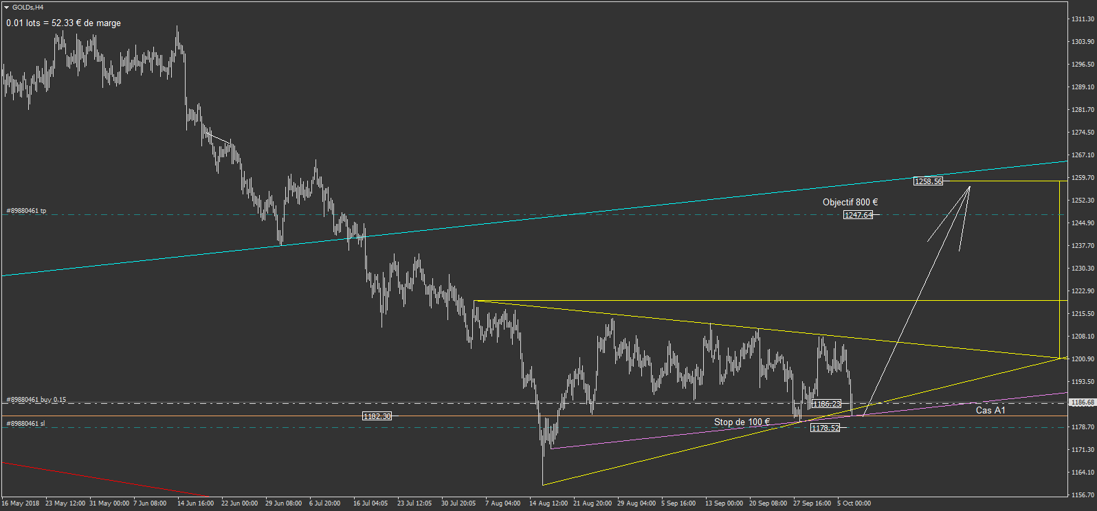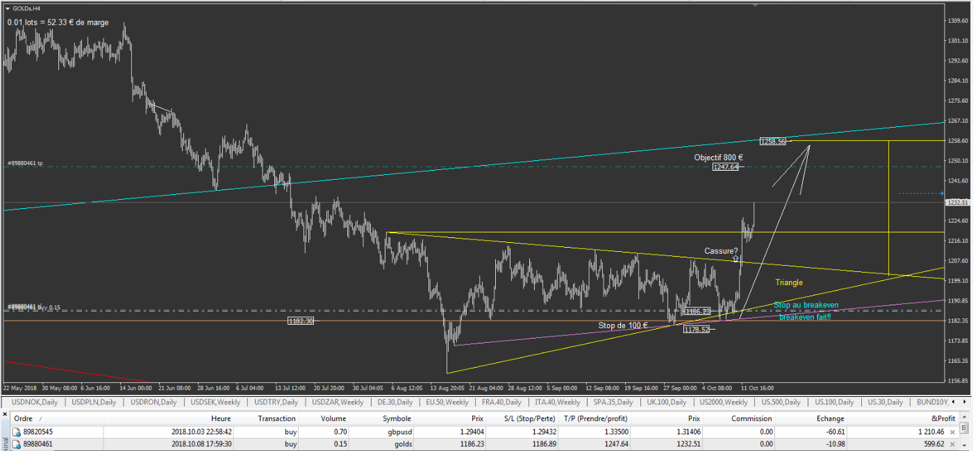 Le GOLD tente une cassure haussière du triangle jaune. si ce triangle fonctionne, alors mon objectif sera atteint. Mais on ne peut pas le savoir à l'avance. J'attend sans rien faire. Etant donné que j'ai déjà mis un stop de 8€ de gain, je ne risque plus que peu.