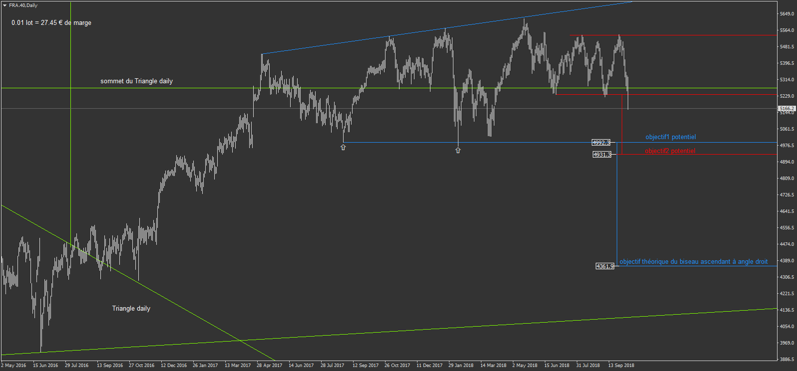 sur le FRA.40 j'imagine une baisse en direction des 4992.3 mais pas directement, il est possible de voir d'abord une hausse au dessus des 5172.6 avant une baisse.
