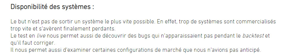 Et je me répète : le but n'est pas de commercialiser à tout prix, quelque chose qui au bout du compte sera foireux au bout de quelques mois, mais d'abord de sortir des systèmes le plus robustes possible avant tout pour moi et en complément de mon trading intraday et à court terme discrétionnaire.