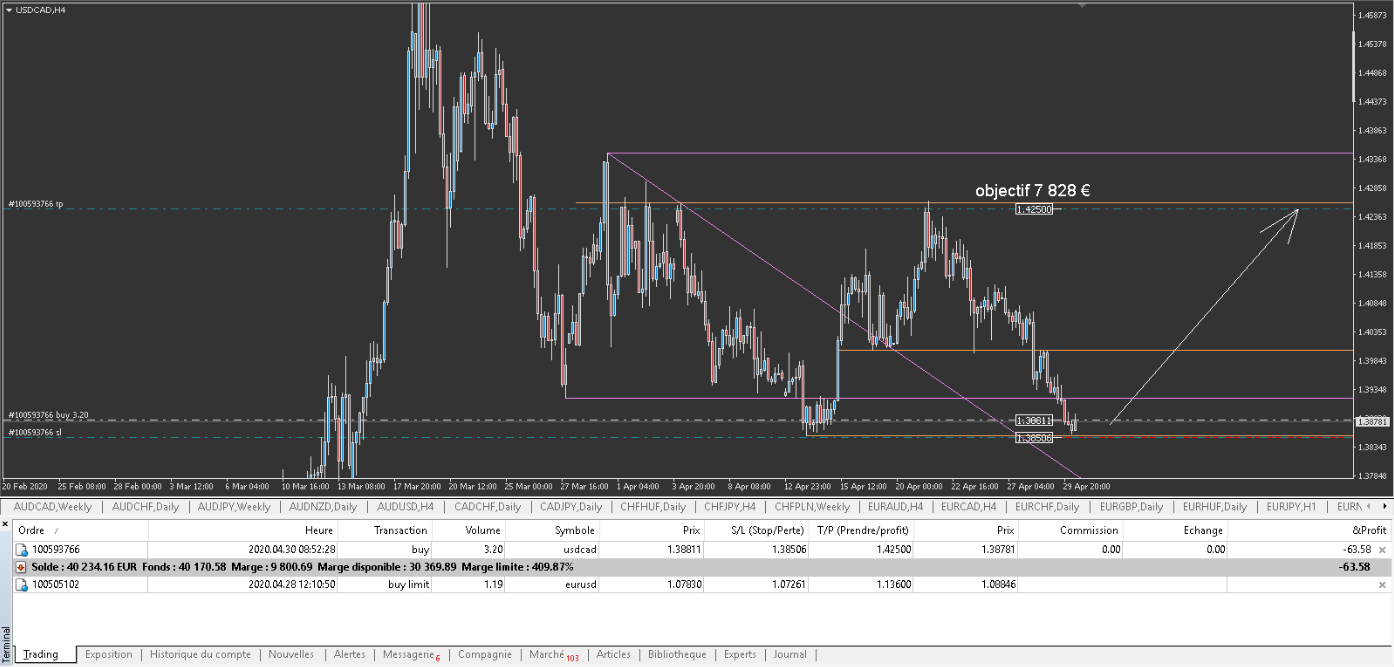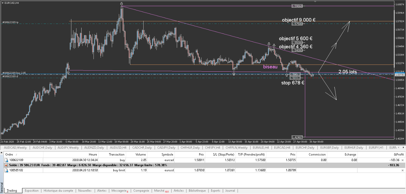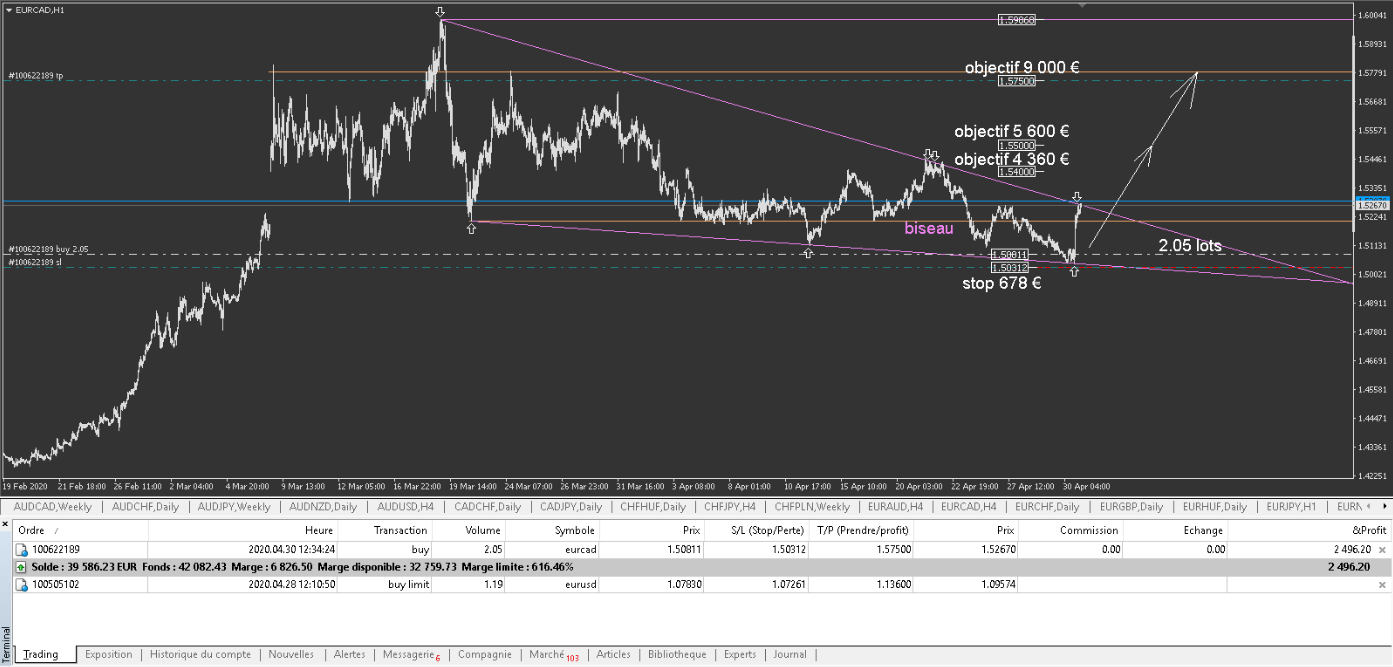 mais je re rentre sur EURCAD car je pense toujours à une fausse cassure baissière de ce Biseau,